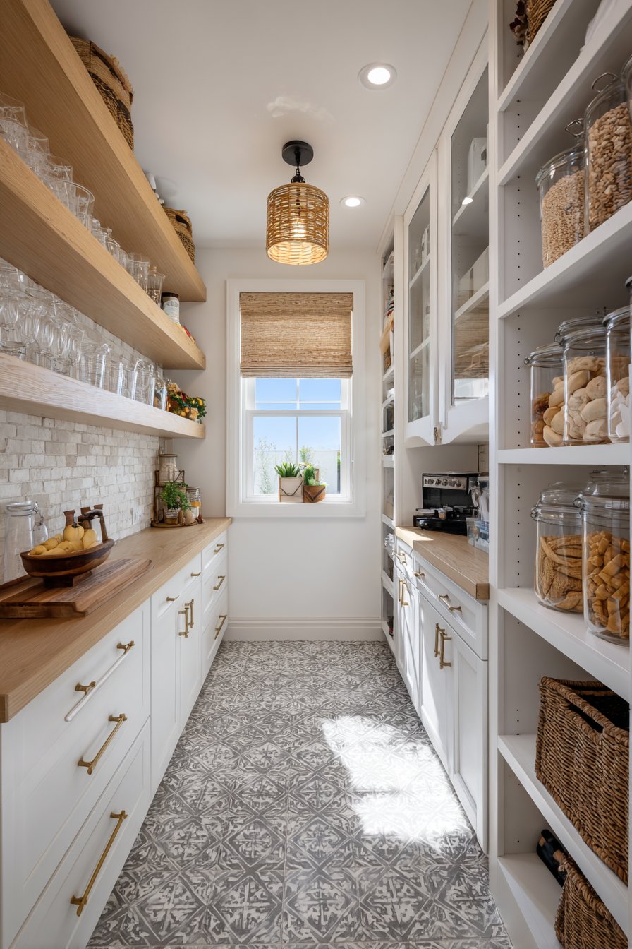 Woven baskets on lower shelves contain root vegetables and packaged snacks. The natural texture contrasts beautifully with the painted wood surfaces. A built-in counter workspace features butcher block surface for meal preparation. This functional area keeps cooking activities organized and efficient.