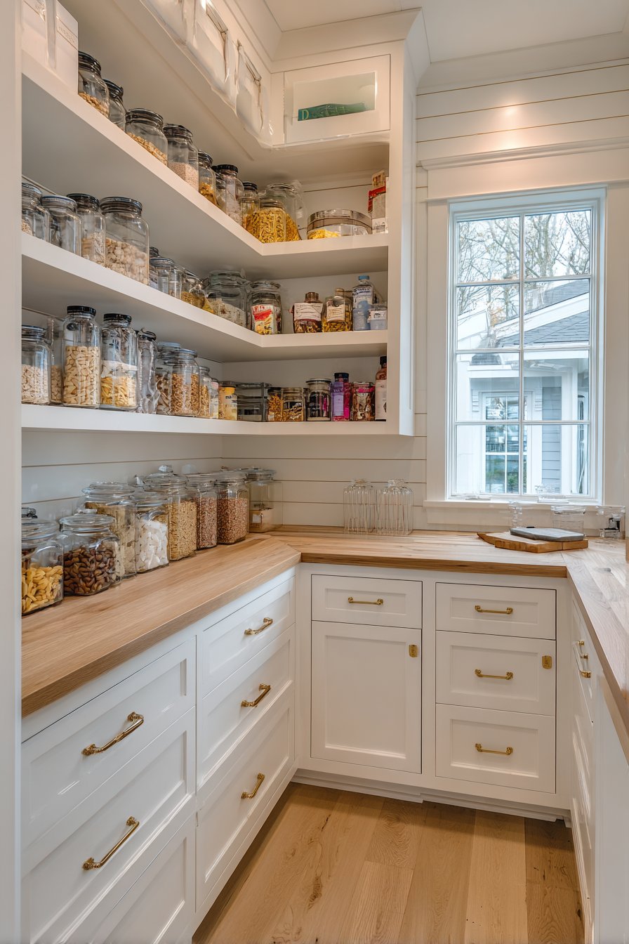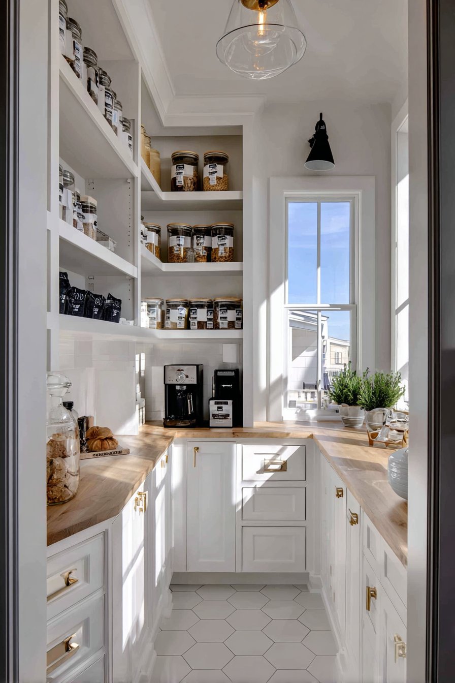 The butcher block countertop spanning the corner serves as an ideal workspace. This natural wood surface adds warmth against the crisp white cabinetry. Meal preparation becomes convenient with dedicated counter space within the pantry. The golden honey tones of the wood complement the brass hardware beautifully. This material combination creates timeless appeal that ages gracefully.