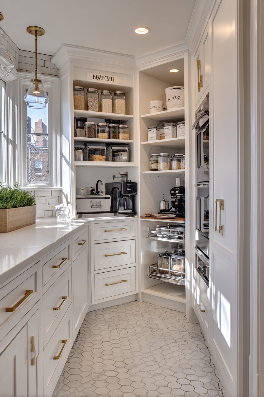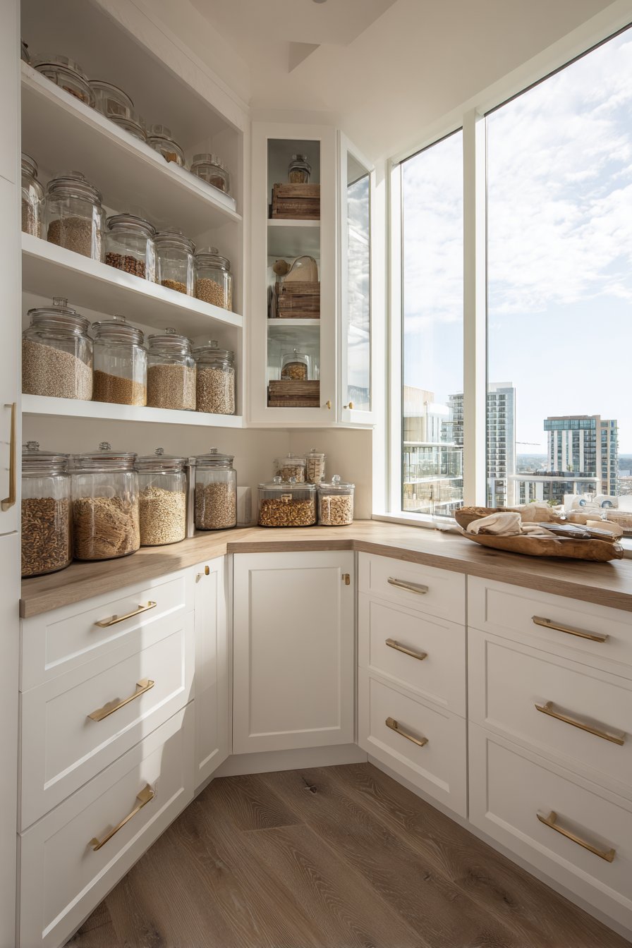 Floor-to-ceiling white cabinetry wraps seamlessly around two adjoining walls in this sophisticated design. The clean lines create visual continuity throughout the space. Custom shelving provides organized display areas for glass canisters filled with dry goods. Lower cabinets feature soft-close mechanisms with elegant brushed brass pulls. Every element works together to maximize storage efficiency.
