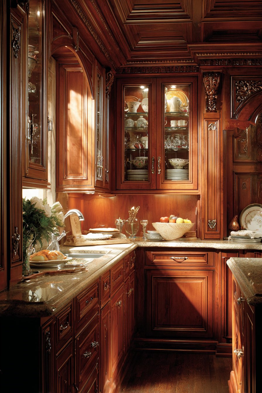 Raised-panel cabinetry in warm cherry wood brings classical elegance to this pantry. The rich reddish-brown tones create welcoming warmth. Ornate oil-rubbed bronze hardware adds vintage sophistication. Glass-front upper cabinets display fine china and serving pieces beautifully. The transparency showcases collections while protecting them from dust.