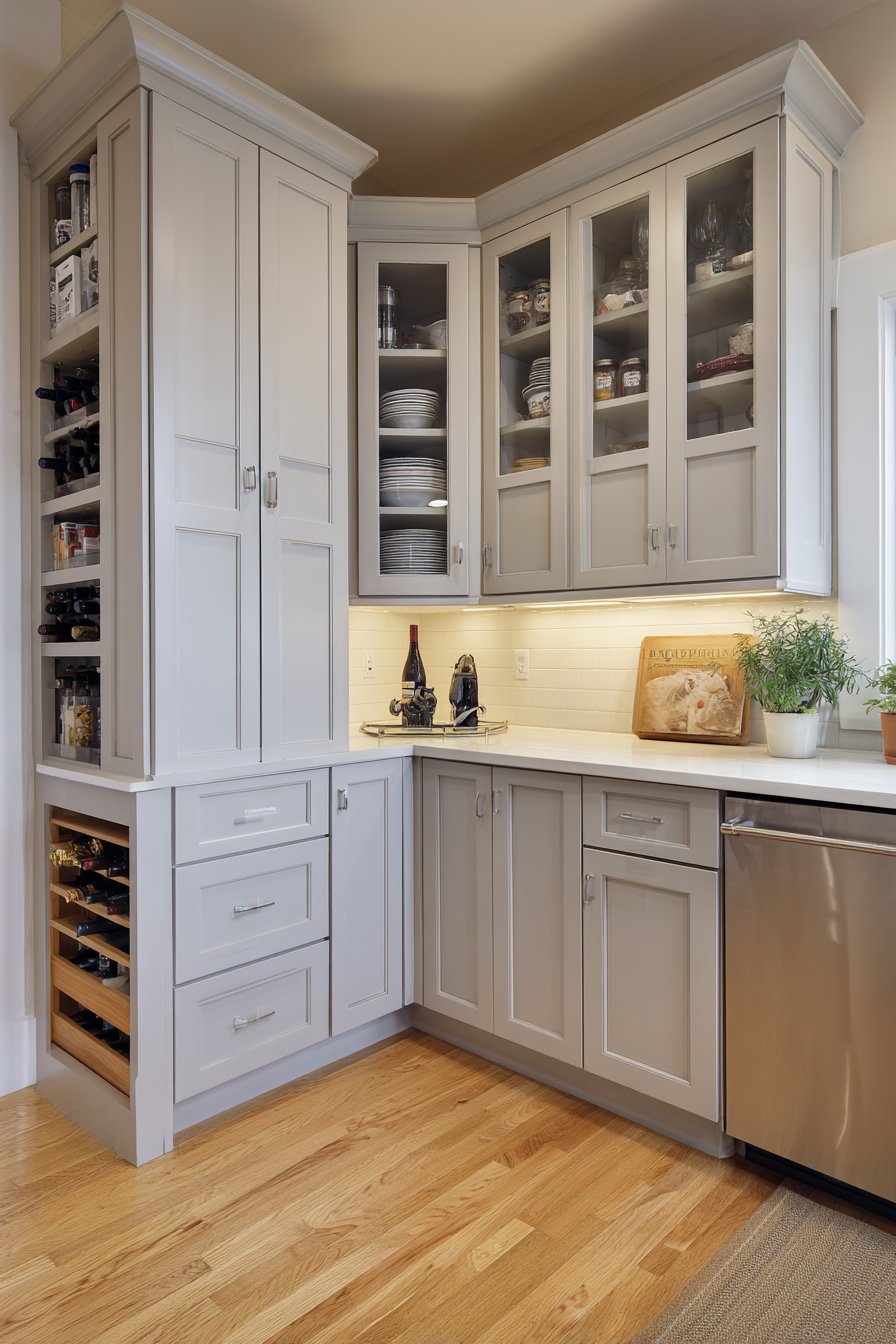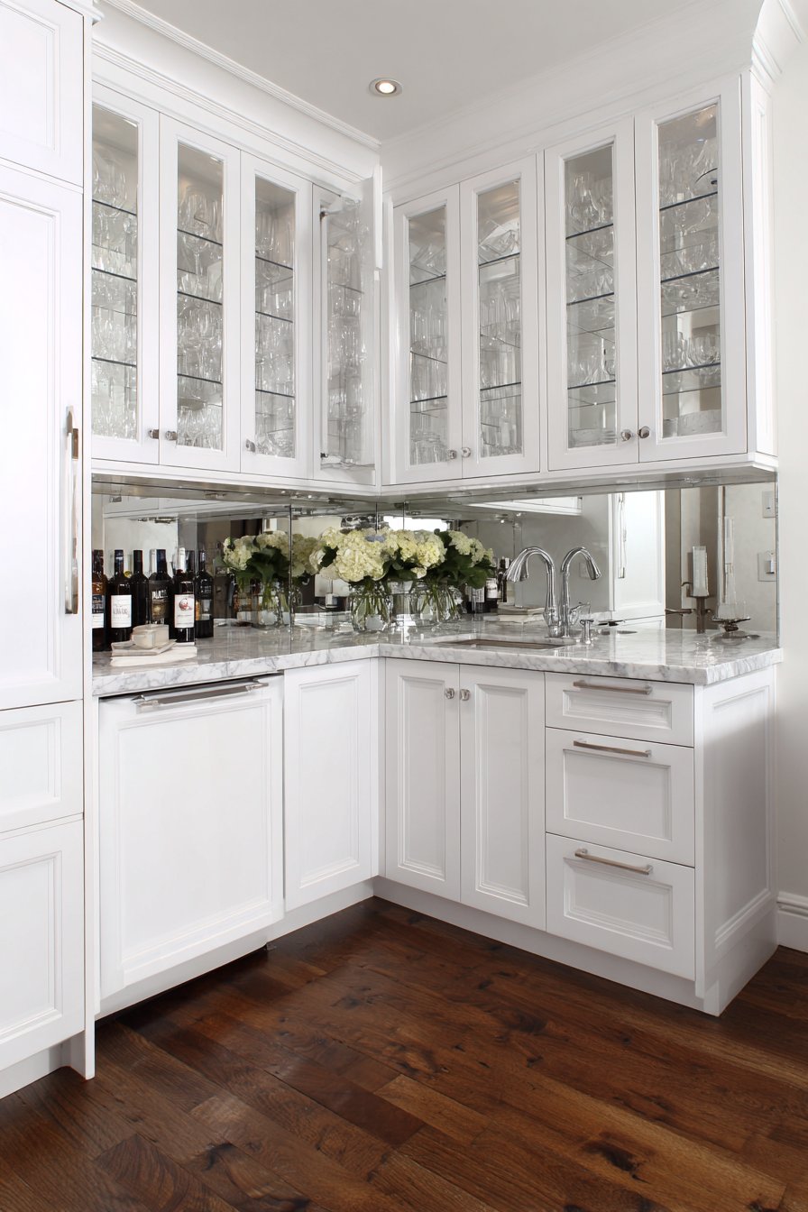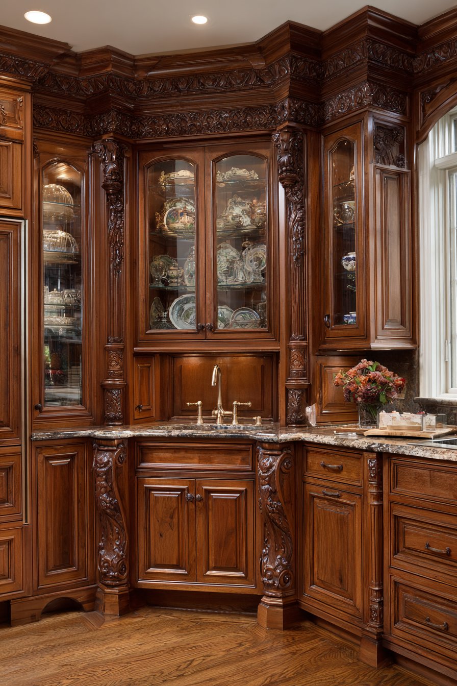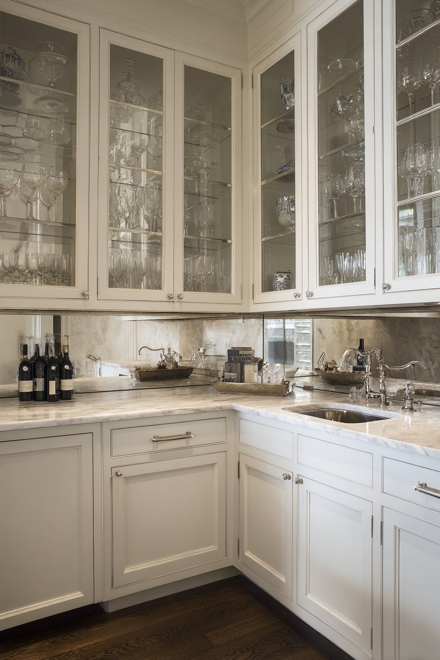 Upper glass-front cabinets display fine glassware along both walls. Lower closed cabinets conceal less attractive storage below. The two-tier approach balances display with practical concealment. The corner features a small undermount sink with articulating faucet. This addition enables dishware prep away from the main kitchen.