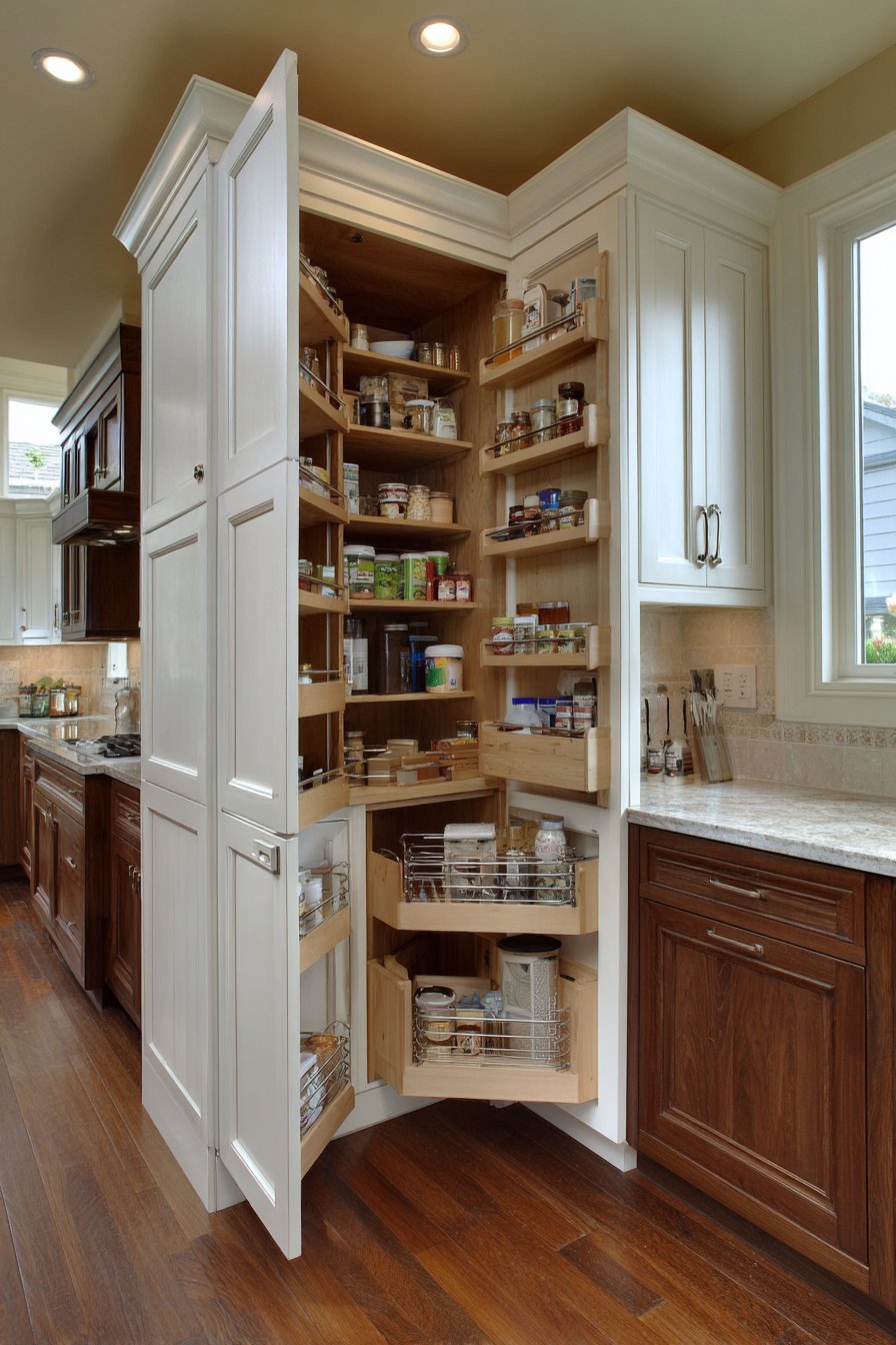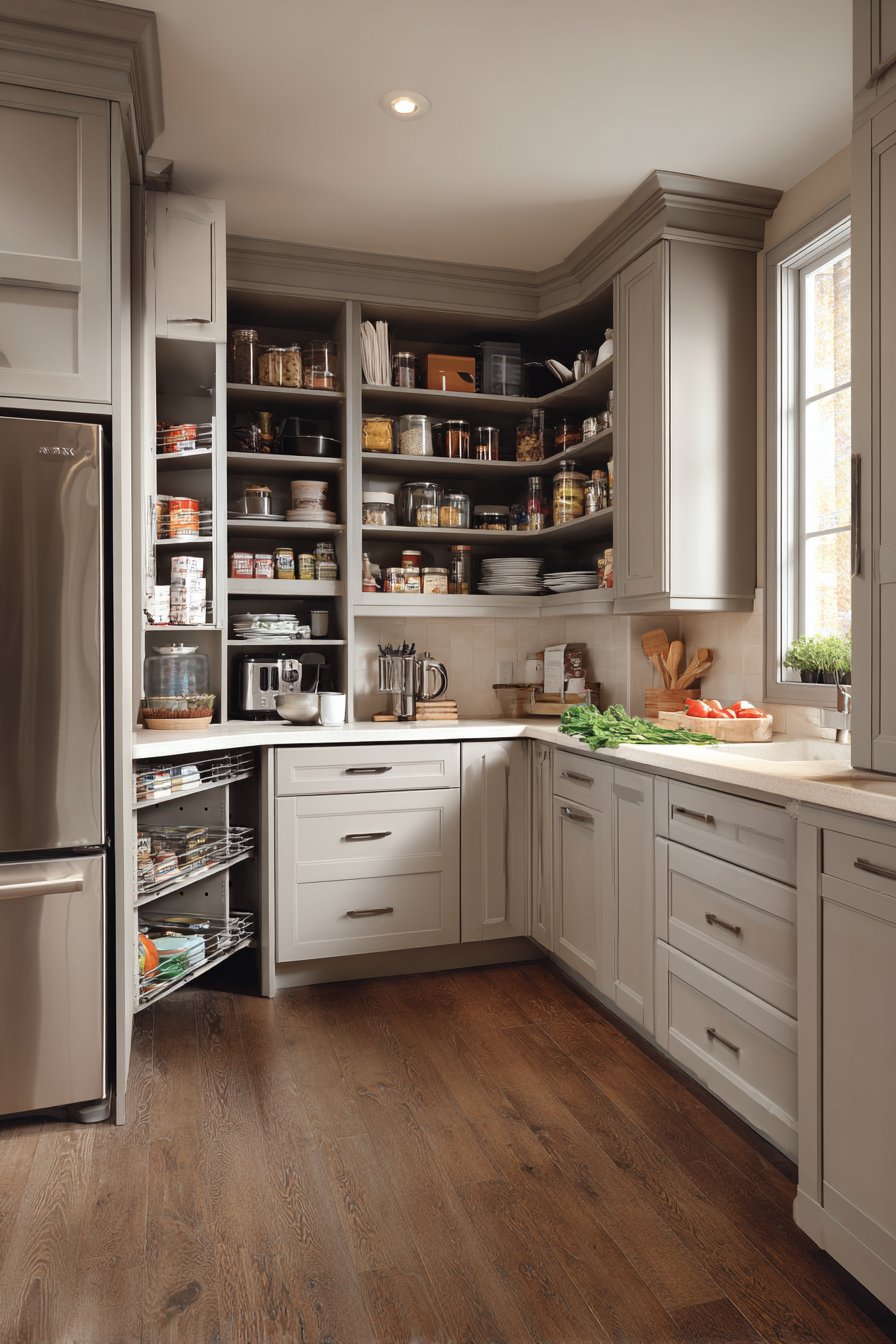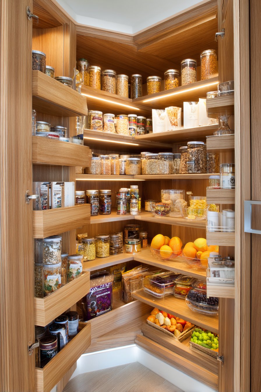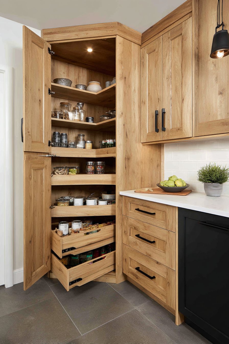 Deep pull-out drawers line both walls in this highly functional configuration. The organizational system provides easy access to items at various depths. Adjustable shelving accommodates containers of different heights. The corner junction features an ingenious lazy Susan mechanism. This rotating system eliminates the dead space that typically plagues corner storage.