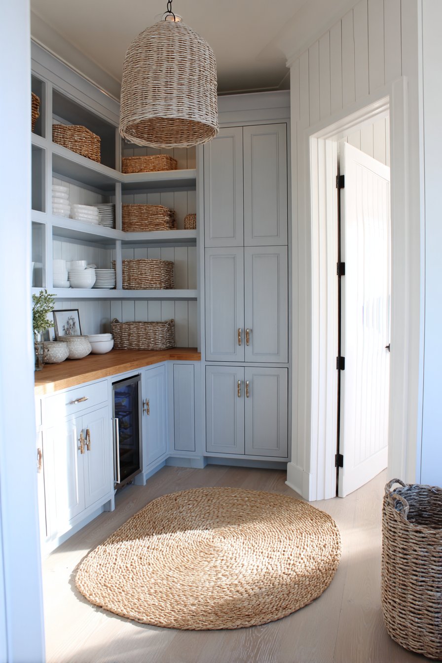 Open shelving displays white ceramic dishware in coordinated stacks. Woven seagrass baskets provide textured storage for dry goods. The corner includes a small beverage refrigerator beneath butcher block countertops. This addition creates a convenient drink station for family gatherings. Natural jute rugs add texture to whitewashed hardwood floors.