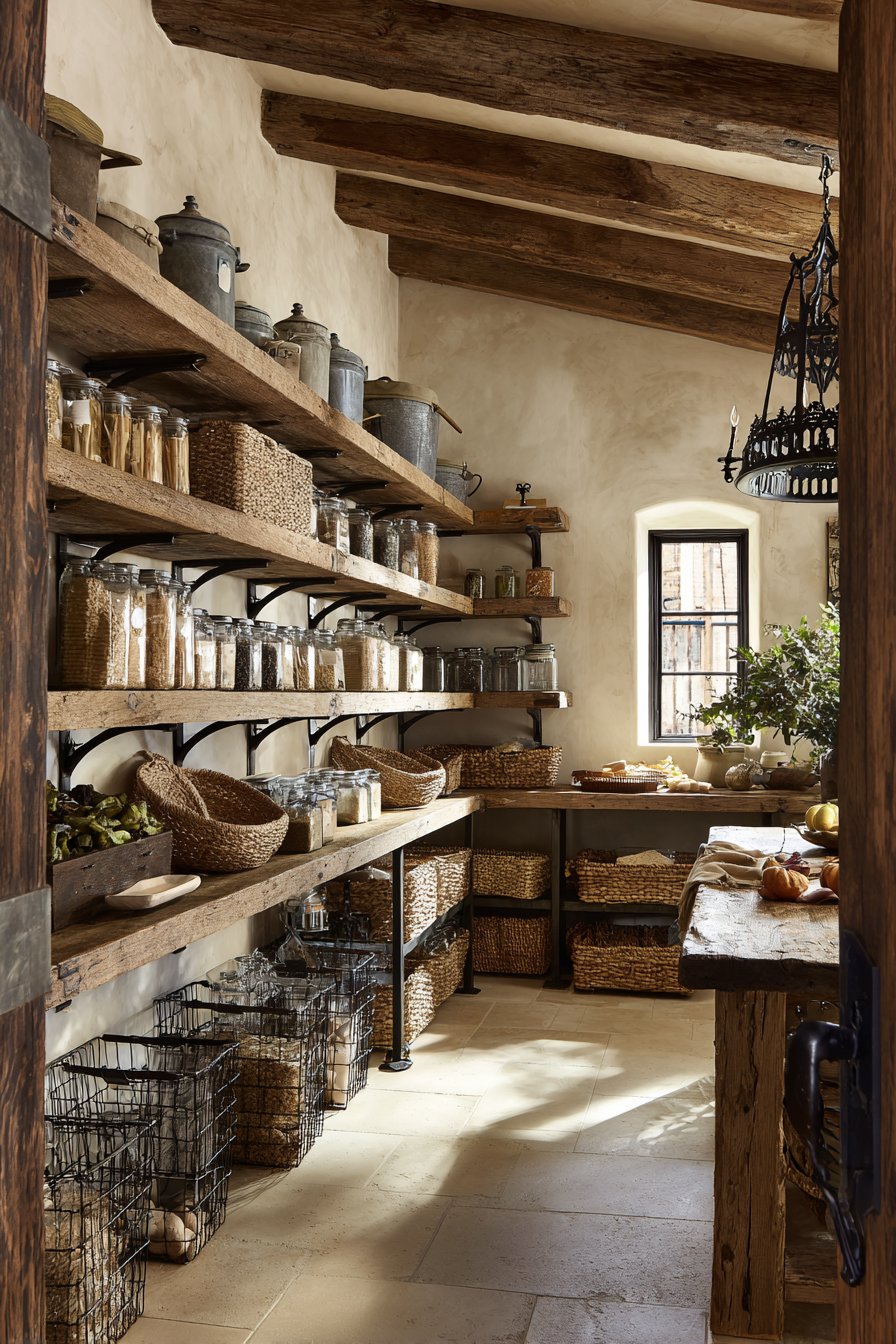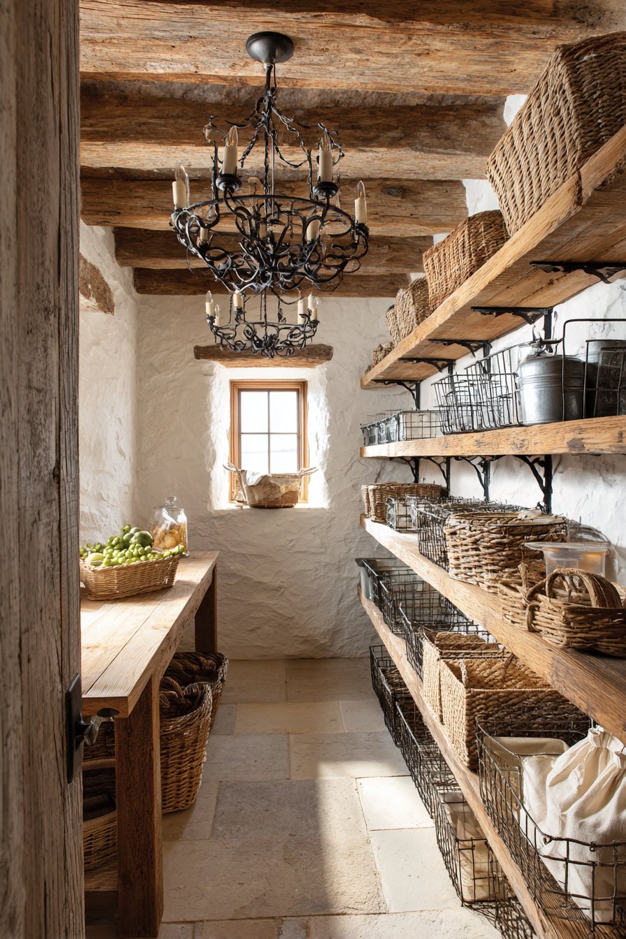 Reclaimed barn wood shelving against white plaster walls creates striking contrast. The weathered wood tells stories of previous lives in agricultural settings. Vintage-style metal brackets support thick wooden shelves securely. Wire baskets and galvanized metal containers provide storage along both walls. These industrial elements complement the rustic wood beautifully.