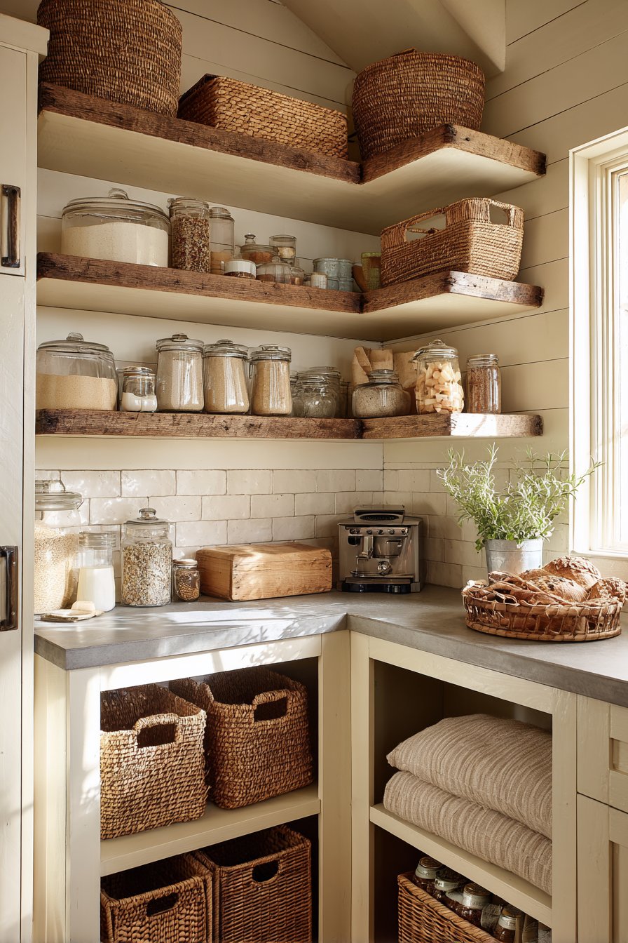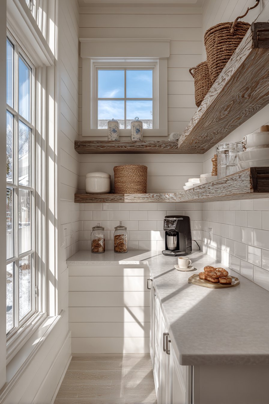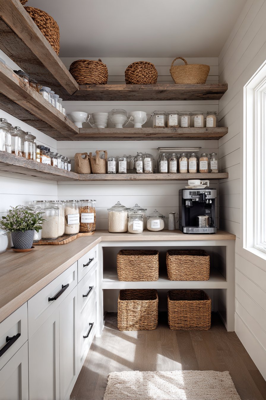 Shiplap accent walls painted in soft white create the foundation for this charming design. The horizontal planking adds texture and architectural interest. Reclaimed wood floating shelves line both walls at varying heights. This arrangement creates visual rhythm while maximizing storage flexibility. Woven baskets and vintage jars display pantry staples with rustic elegance.