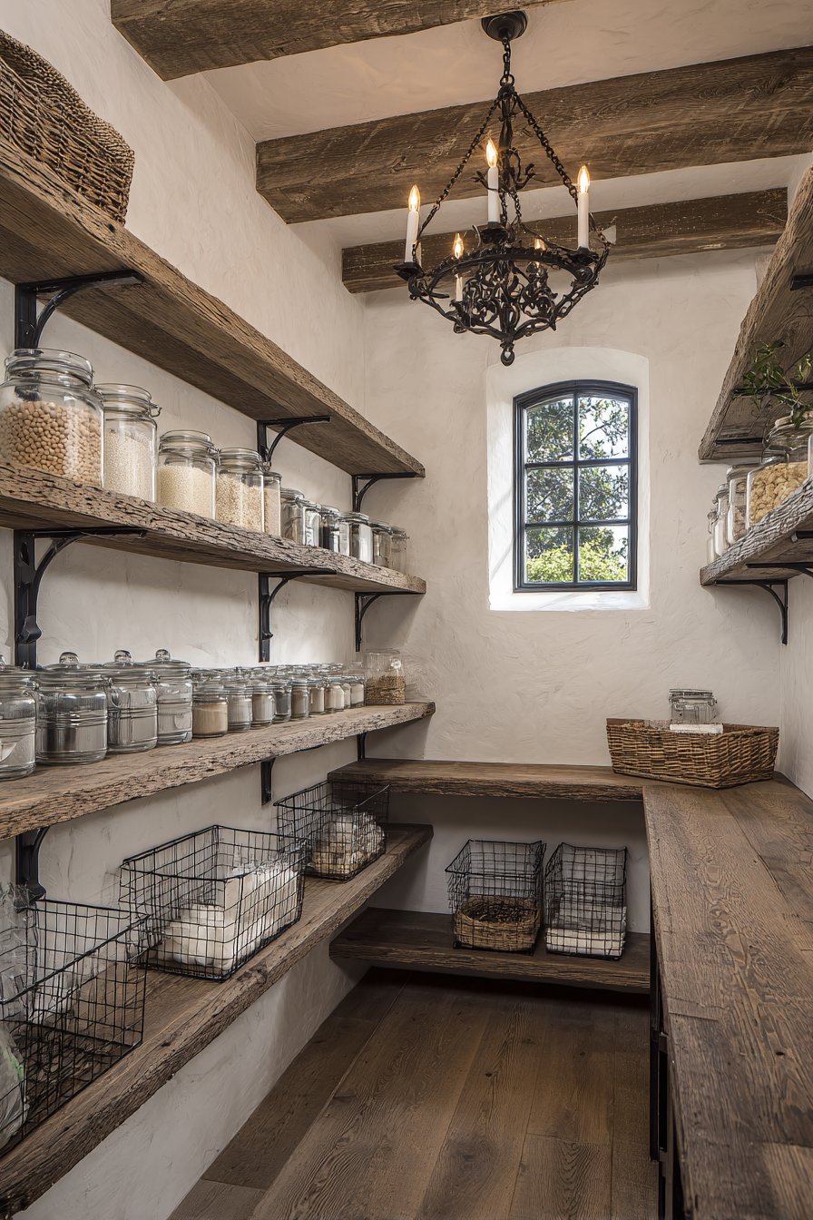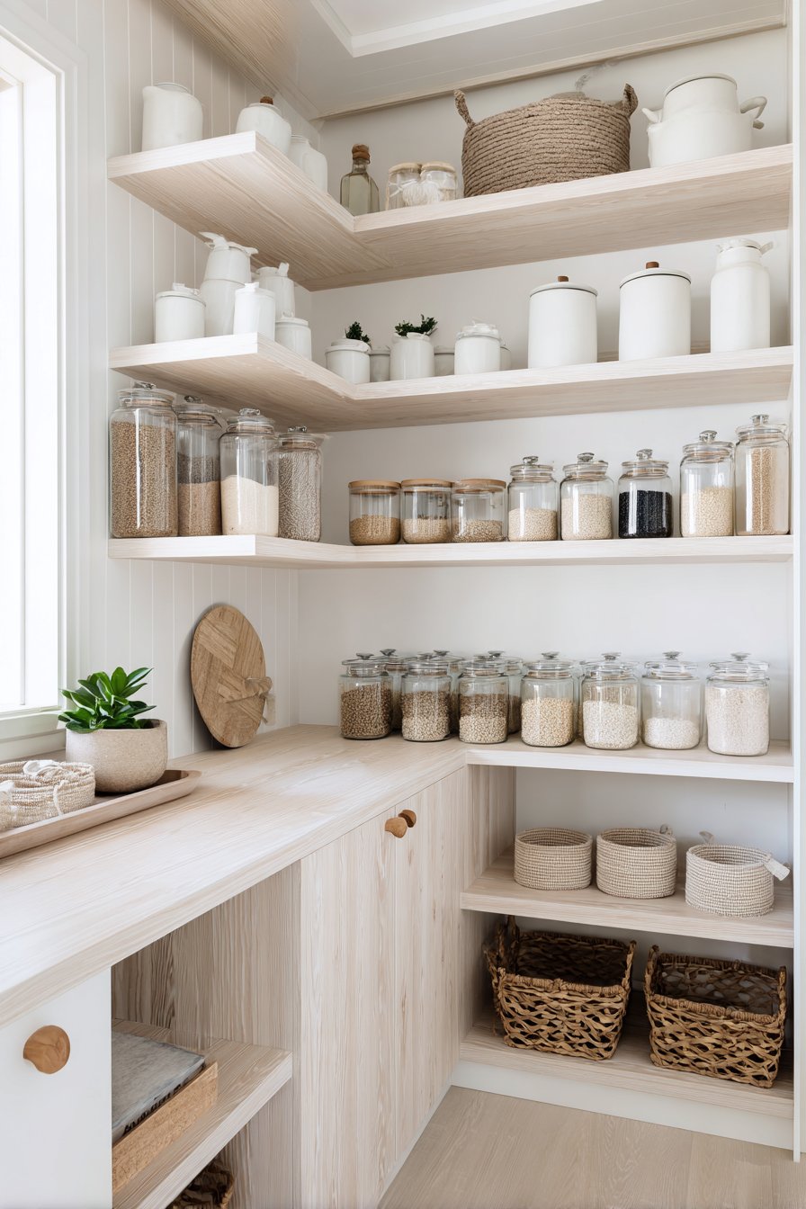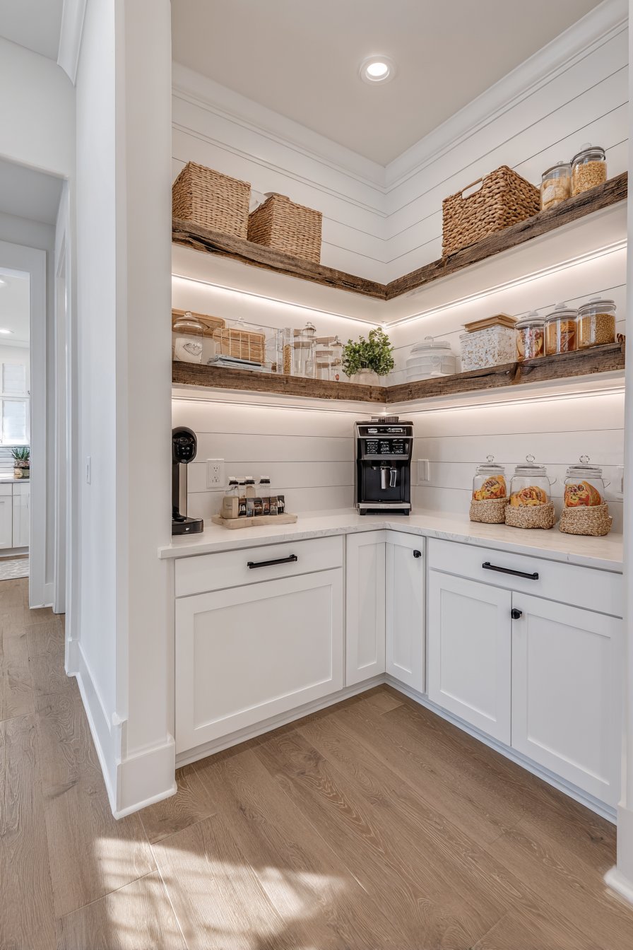 Shiplap accent walls painted in soft white create the foundation for this charming design. The horizontal planking adds texture and architectural interest. Reclaimed wood floating shelves line both walls at varying heights. This arrangement creates visual rhythm while maximizing storage flexibility. Woven baskets and vintage jars display pantry staples with rustic elegance.