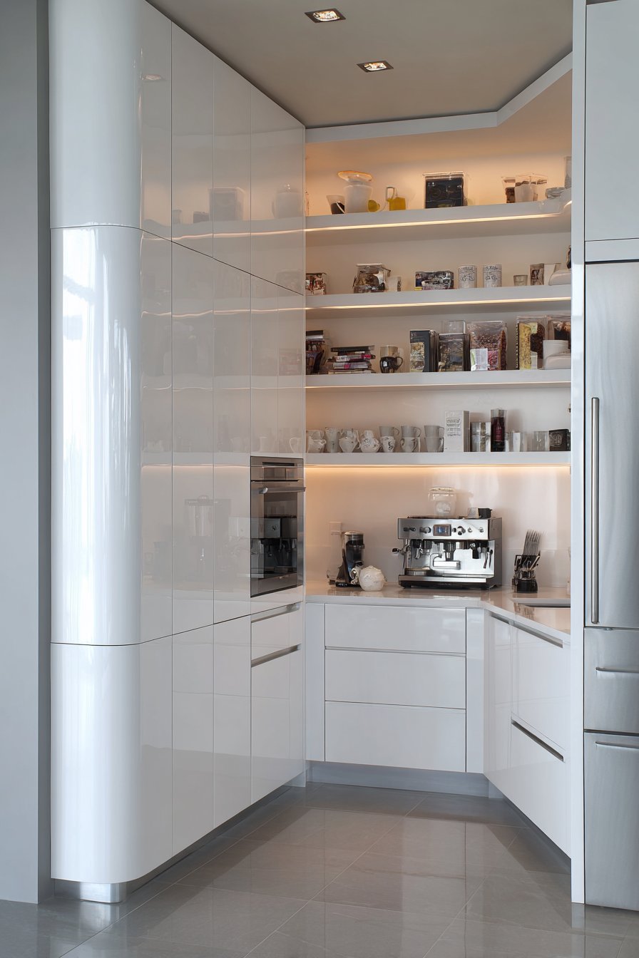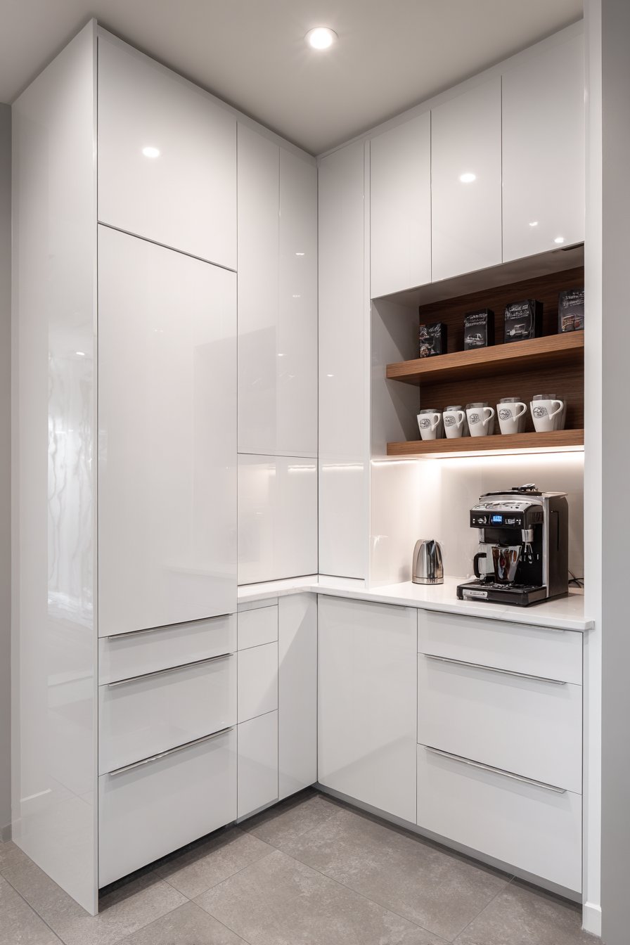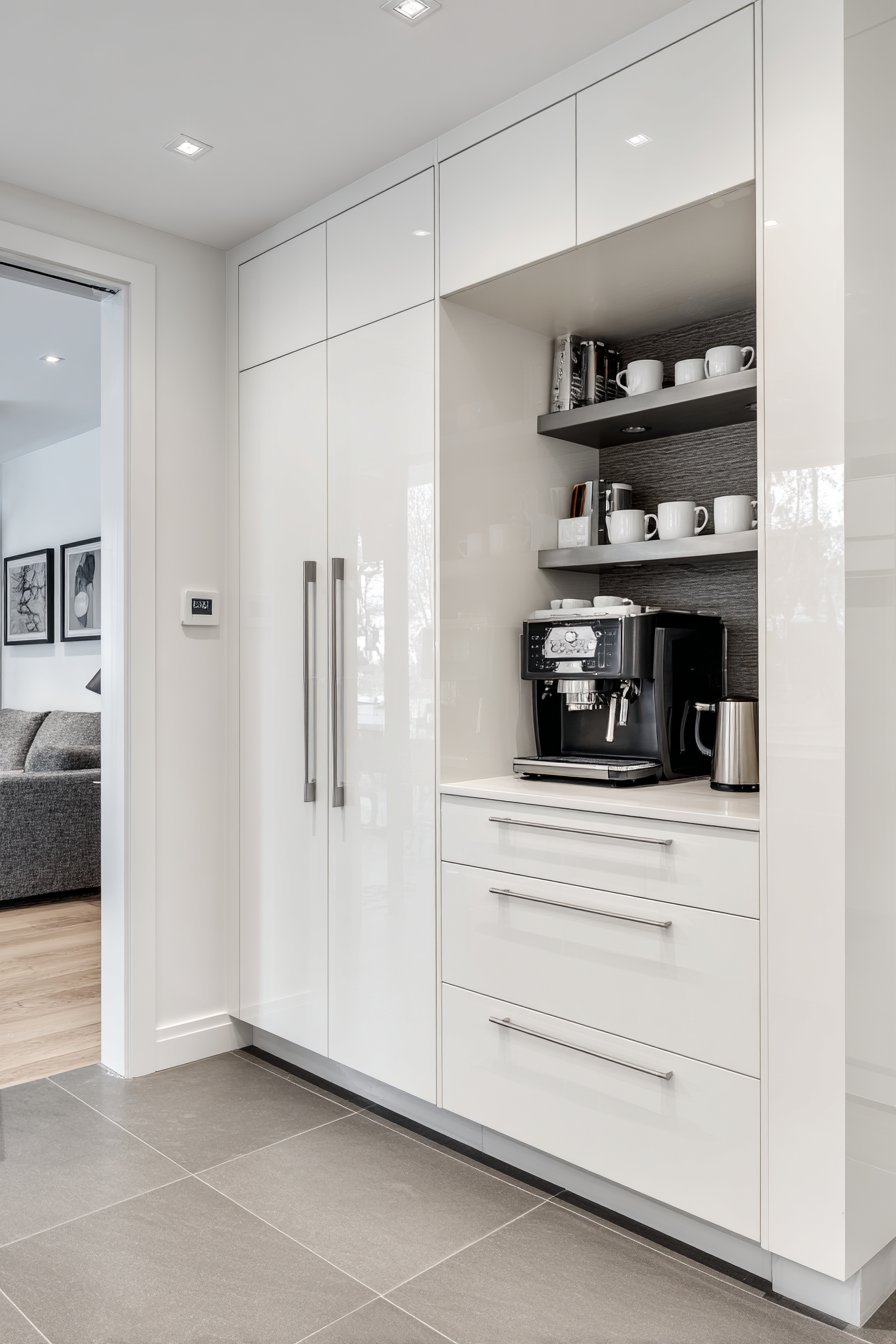 High-gloss white lacquered cabinets with integrated handles create seamless modern surfaces. The reflective finish amplifies light throughout both walls. Handleless design eliminates visual interruption from protruding hardware. The corner includes a sophisticated built-in coffee bar station. Dedicated space for an espresso machine elevates daily morning routines.