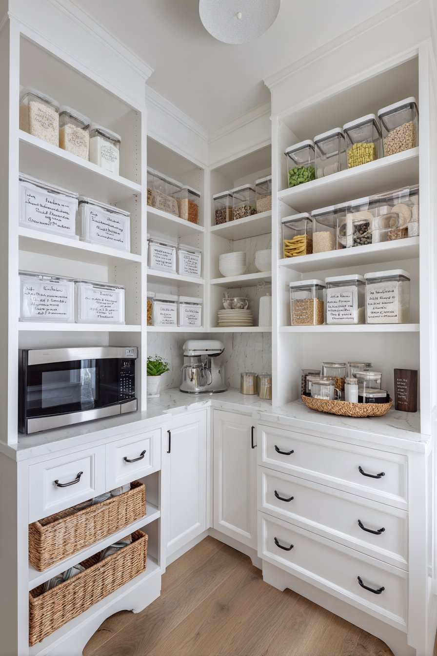 Custom organization with labeled bins creates social media-worthy perfection. Clear acrylic containers display pantry contents beautifully. Matching storage solutions throughout both walls create visual harmony. White built-in cabinetry wraps the space with combination of drawers and shelving. The mix of open and closed storage balances display with concealment.