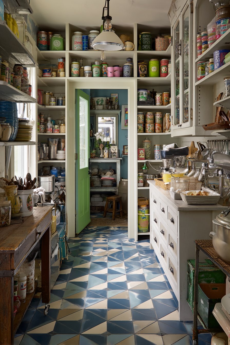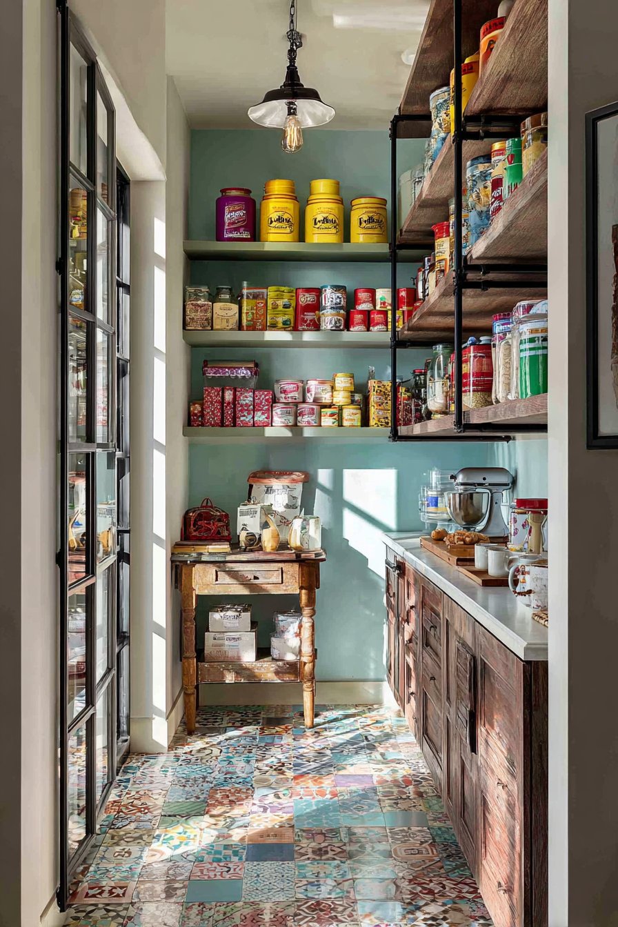 Open metal shelving on one wall combines with vintage wooden cabinets on the opposite side. This intentional mismatch creates collected-over-time character. Colorful ceramic canisters and varied storage containers add personality. The eclectic approach celebrates individuality rather than matching perfection. A small vintage desk repurposed as baking station occupies the corner.