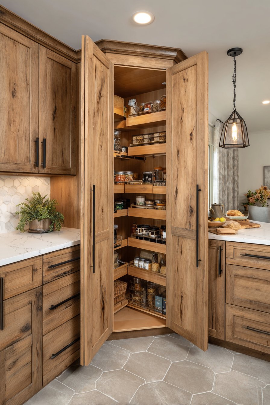 The organizational systems featured across these designs address real-world storage challenges. Pull-out shelves eliminate digging through deep cabinet interiors. Lazy Susan corners make previously inaccessible spaces functional. Vertical dividers organize flat items efficiently. These solutions demonstrate that proper organization systems matter more than total square footage.