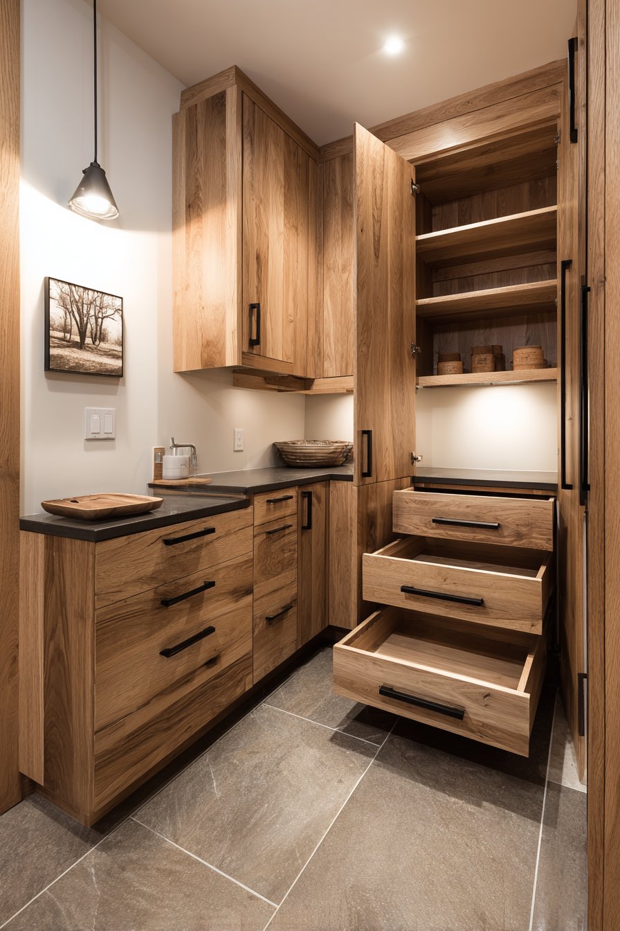 Warm wood-tone cabinets in natural oak bring organic beauty to the pantry. The rich grain patterns add visual interest throughout the space. Matte black hardware creates striking contrast against the lighter wood. This combination achieves a balanced contemporary aesthetic. The hardware’s durability ensures smooth operation for years of daily use.