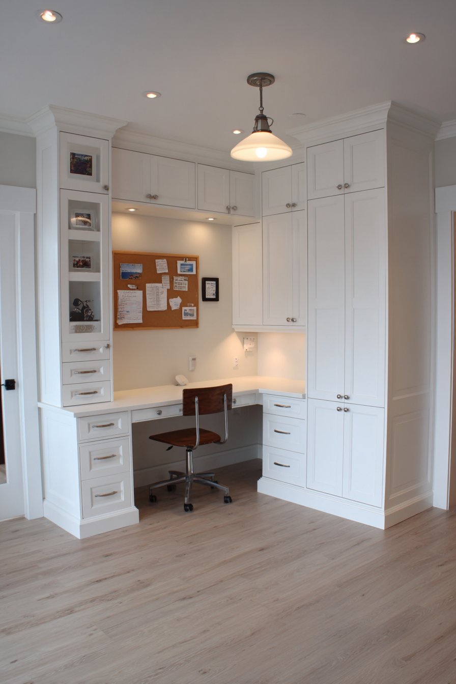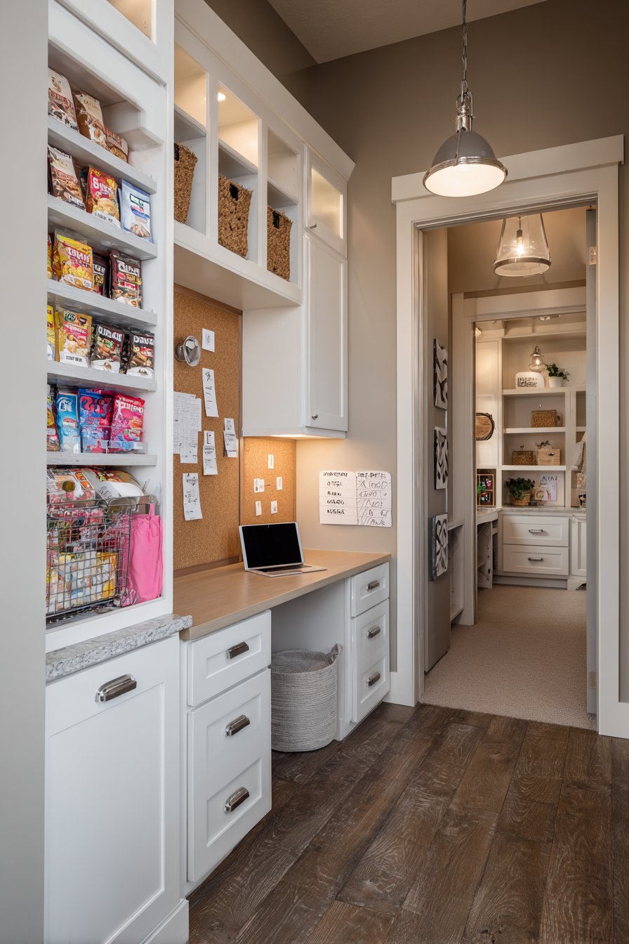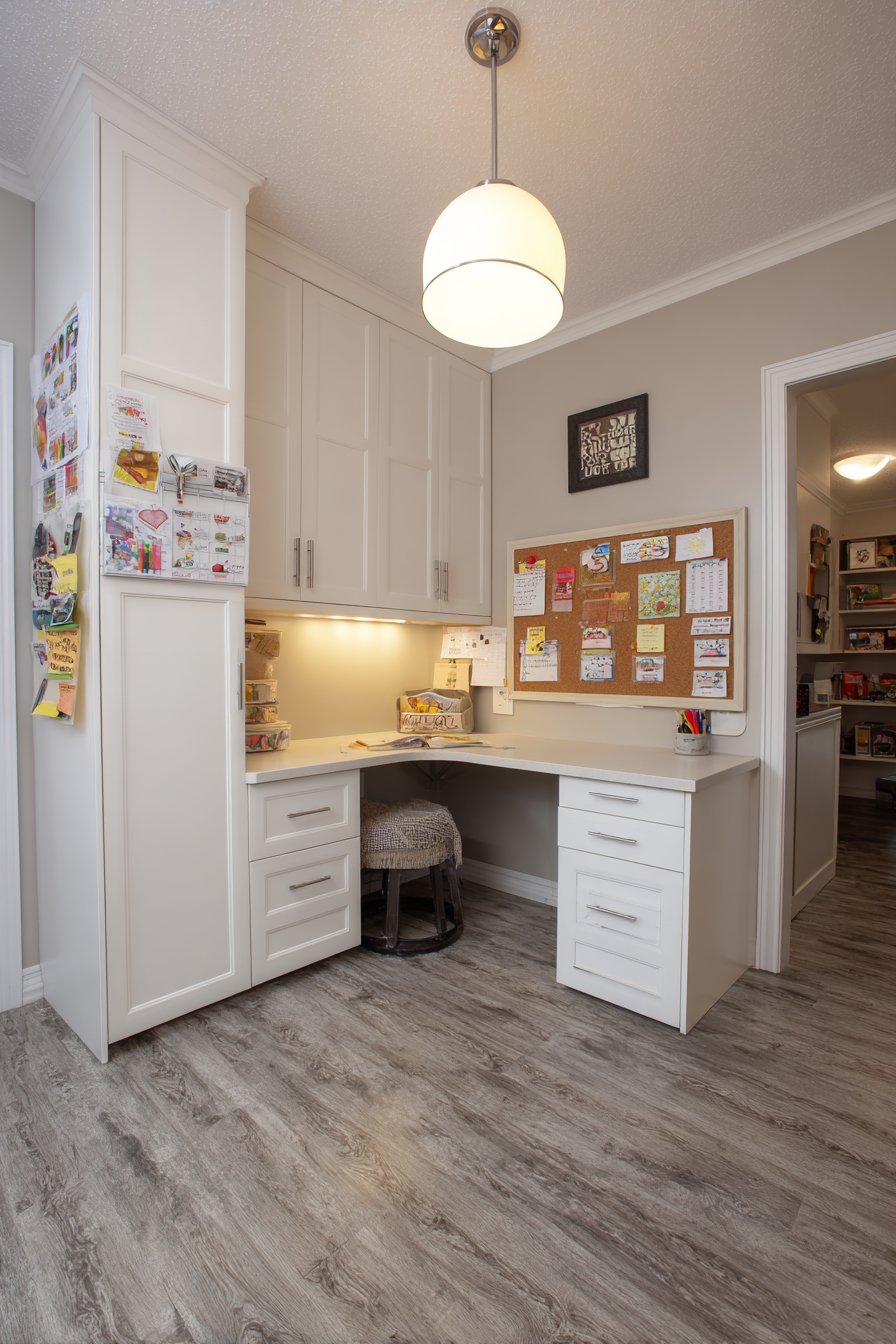 Cork board mounted above the desk displays notes and schedules. The bulletin board keeps family information visible and organized. A combination of closed cabinets and open cubbies provides flexible storage options. Durable laminate flooring withstands heavy traffic from family use. Pendant light over the desk supplements overhead recessed lighting.