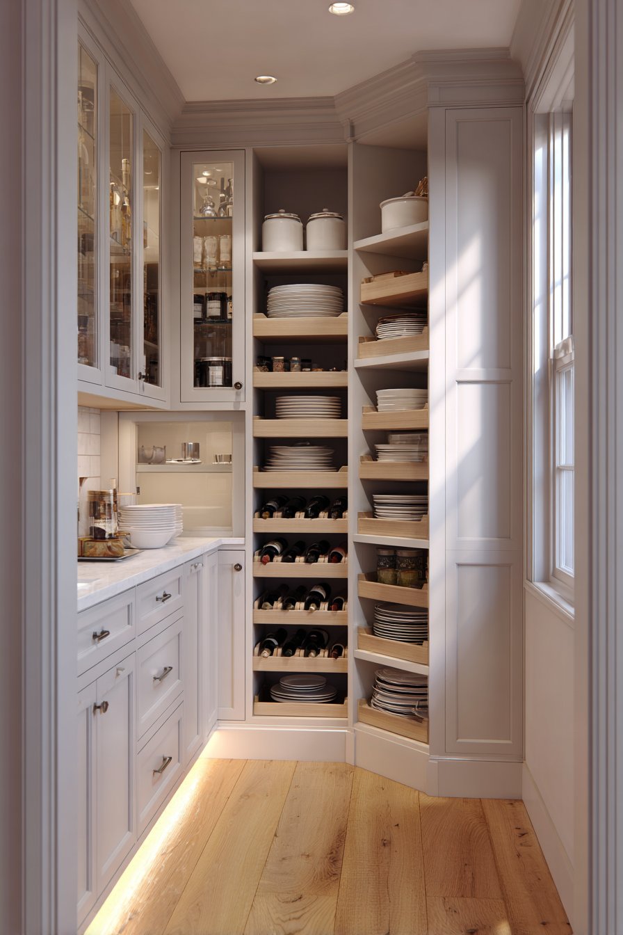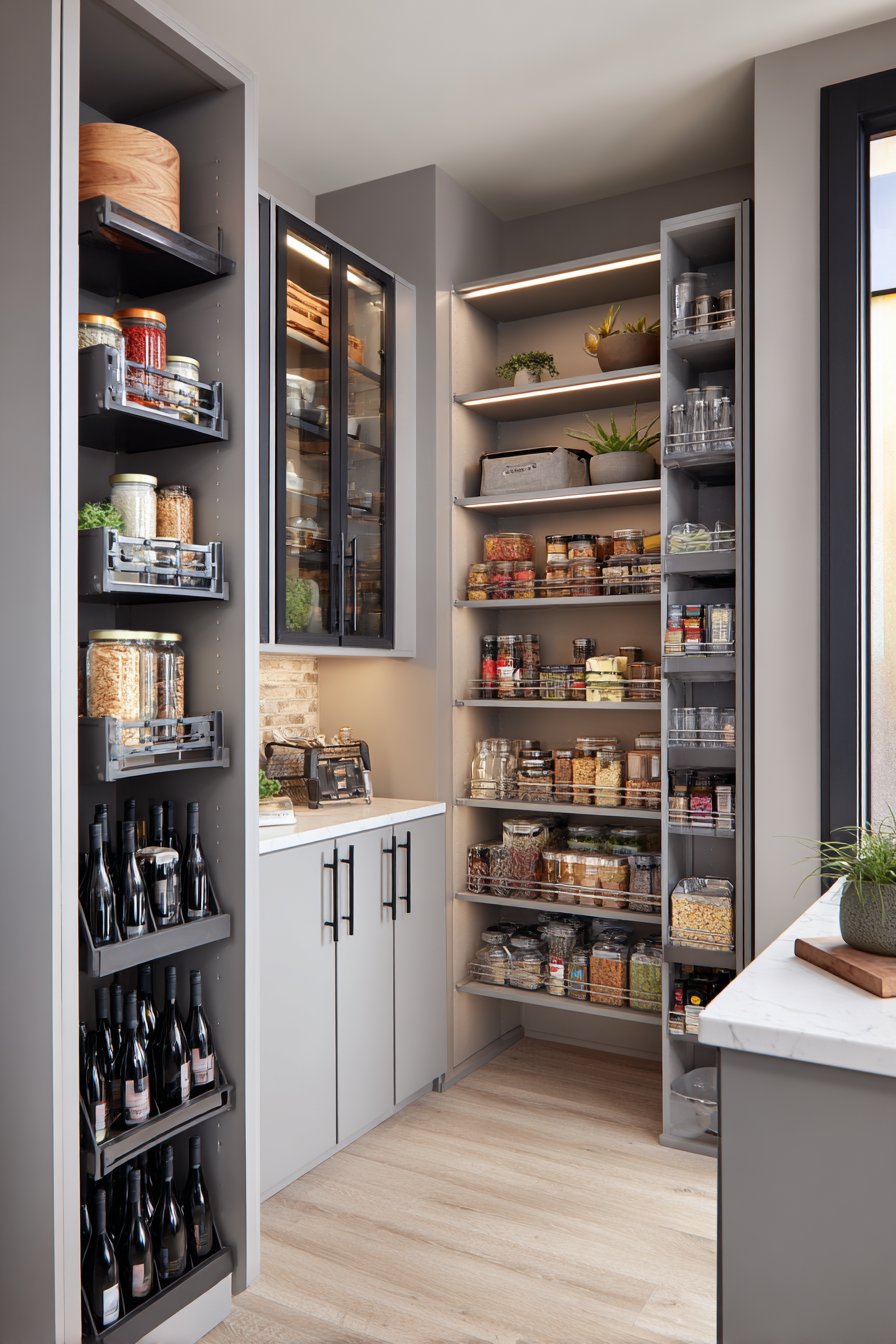 Narrow pull-out spice racks and tiered shelf organizers fill every vertical inch along both walls. This space-saving approach proves ideal for smaller pantries. Light grey cabinets create an airy feeling despite the compact dimensions. Glass-front upper doors reveal neatly stacked dishes and organized food containers. The transparency adds visual depth to the narrow space.