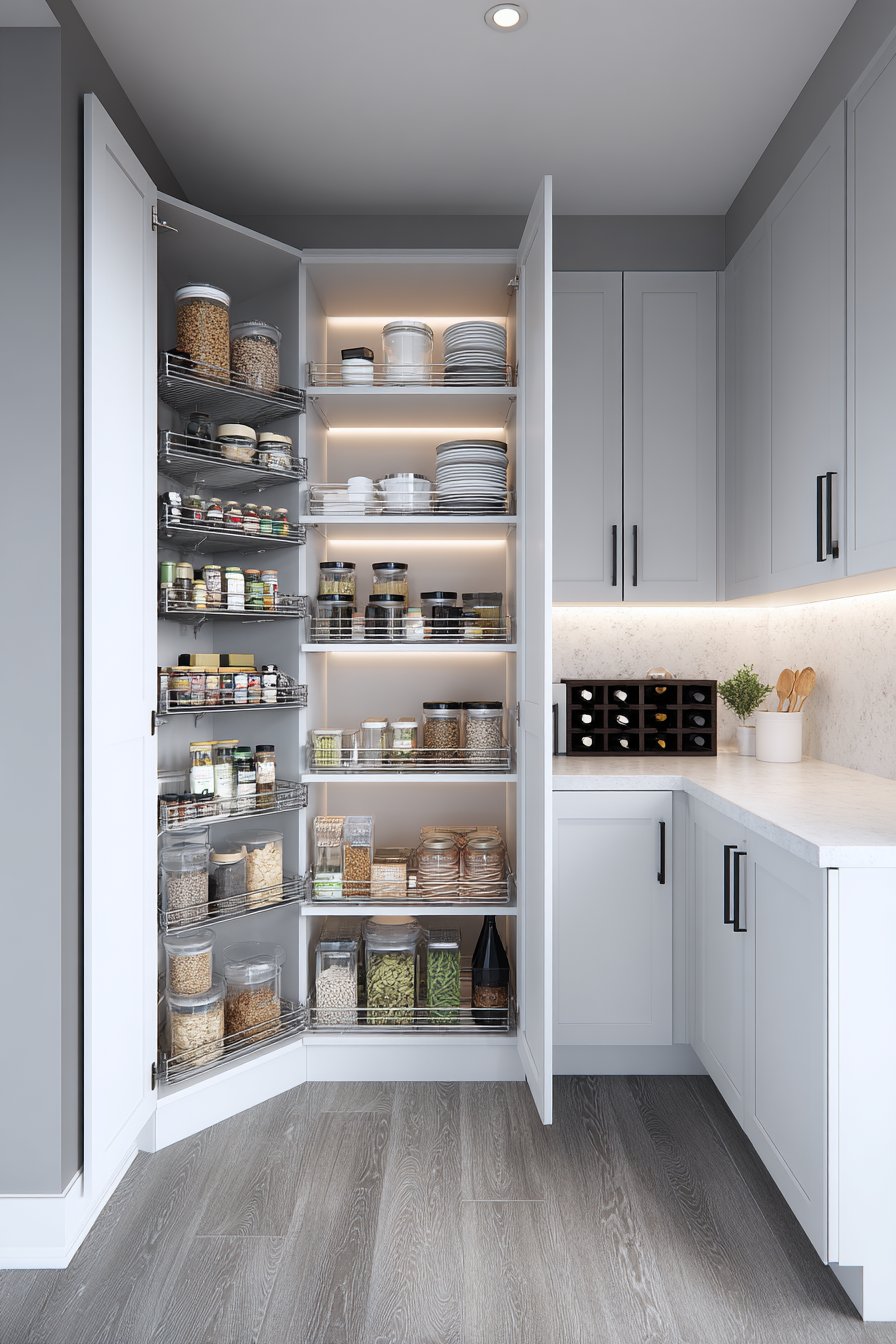 Creating an efficient L-shaped pantry transforms how you organize your kitchen essentials. This clever configuration maximizes corner space while providing exceptional storage capacity. The design works beautifully in both compact areas and spacious walk-in pantries.
