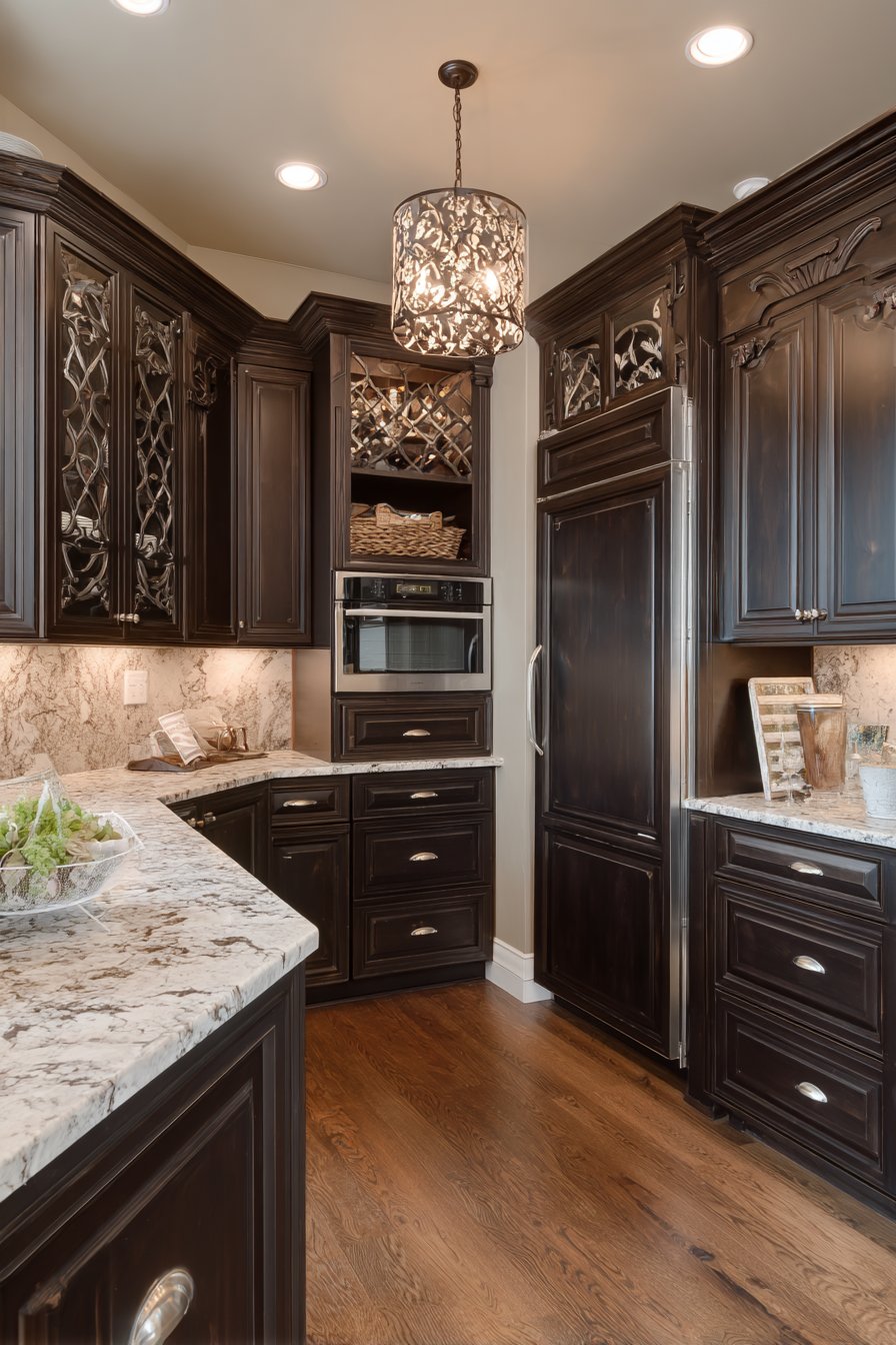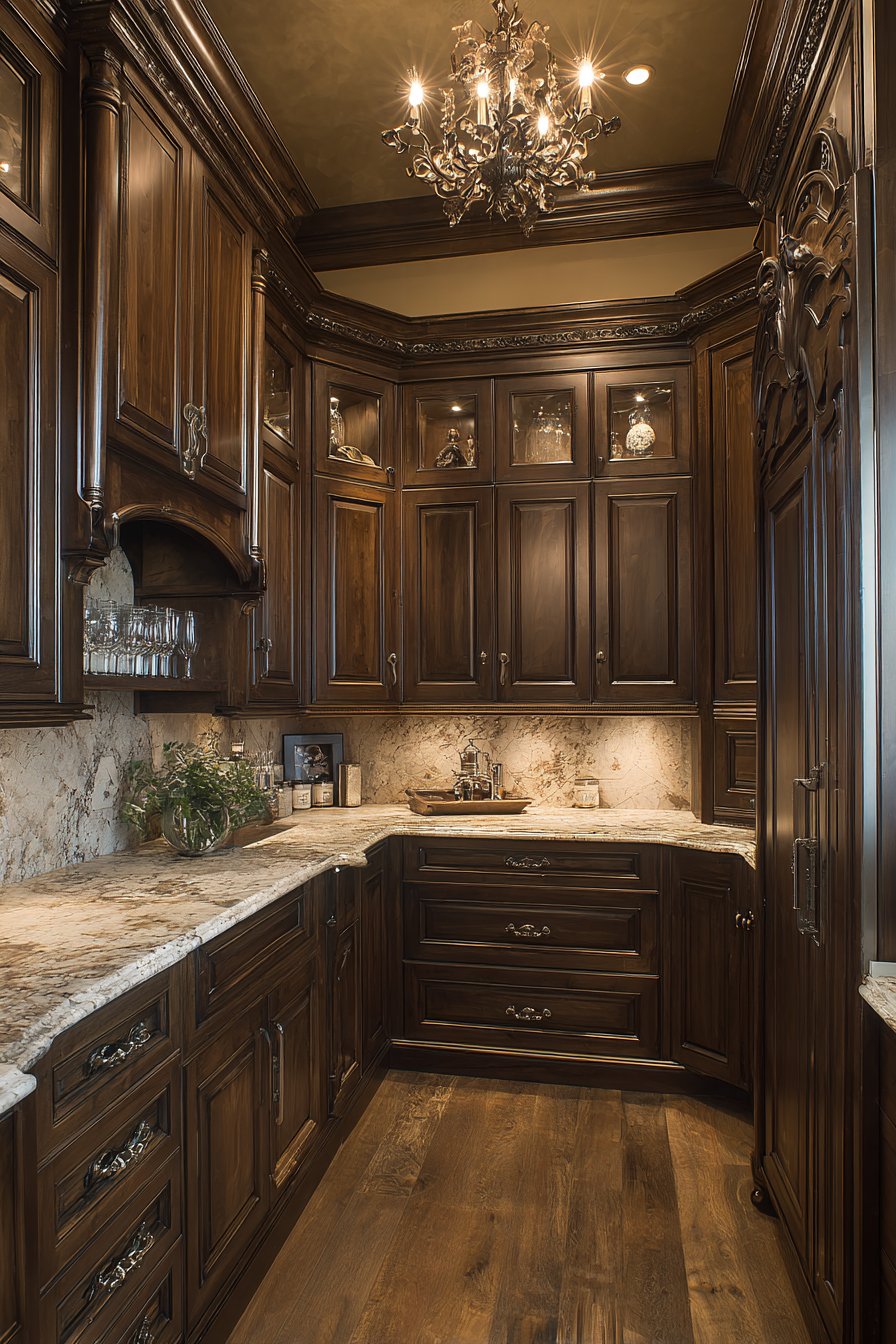 Custom dark walnut cabinetry showcases intricate millwork details throughout this elegant design. The rich wood tones create sophisticated drama in the pantry space. Antique brass hardware adds vintage elegance against the deep brown wood. Marble countertops span the corner workspace with matching backsplash protection. The natural stone veining introduces an organic pattern to the design.