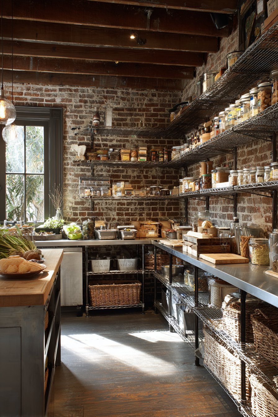 Exposed brick accent walls bring raw architectural character to one side of this pantry. The aged brick texture provides dramatic visual contrast. Metal wire shelving systems on the opposite wall maintain the industrial aesthetic. Edison bulb pendant lights hang from exposed ceiling beams overhead. This combination creates an authentic warehouse-inspired design.