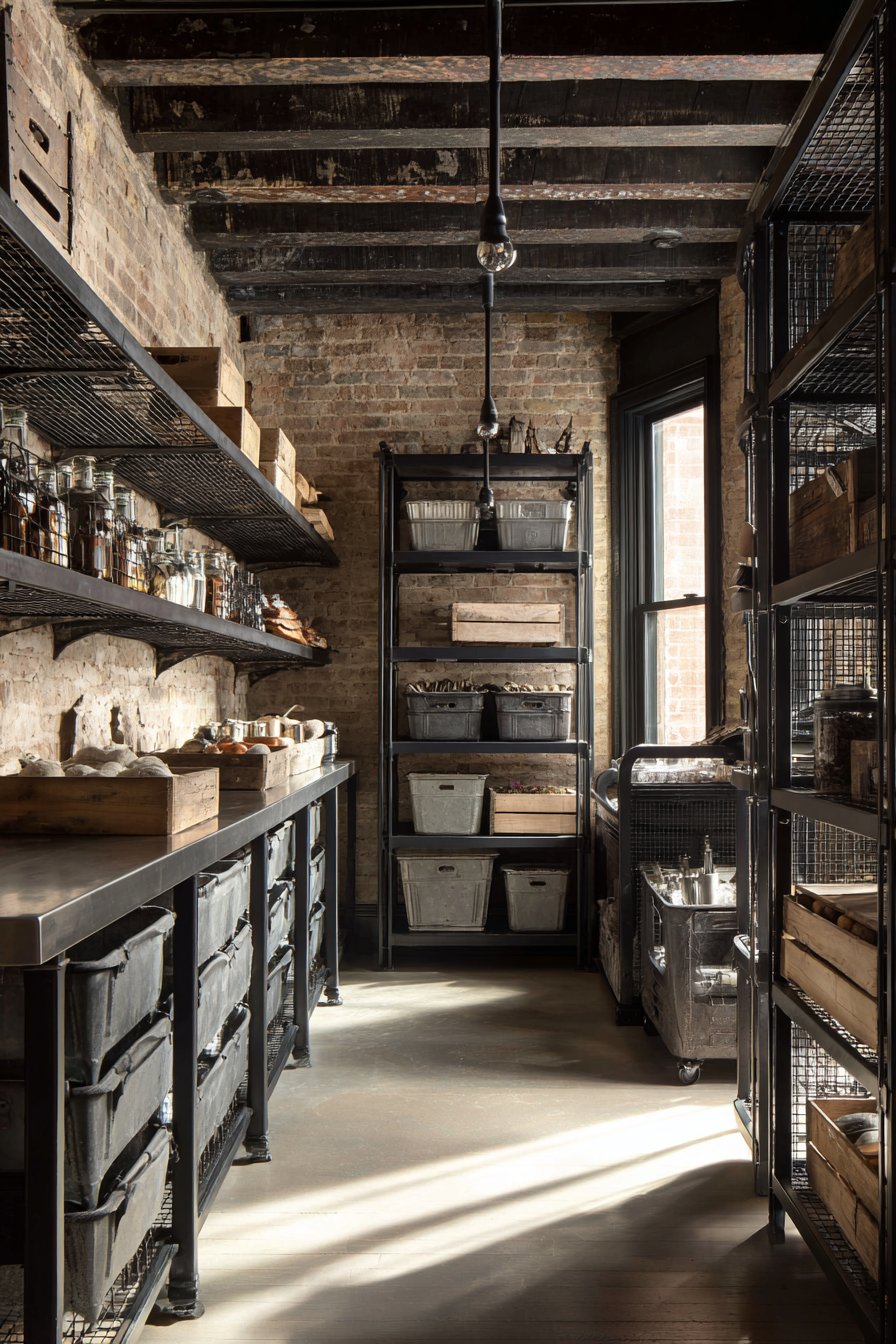 Galvanized metal bins and wooden crates provide rustic storage solutions. These containers add functional organization while enhancing the industrial style. A stainless steel prep counter occupies the corner junction. The commercial-grade surface handles heavy use and cleans easily. Black metal pipe shelving brackets support thick reclaimed wood shelves.