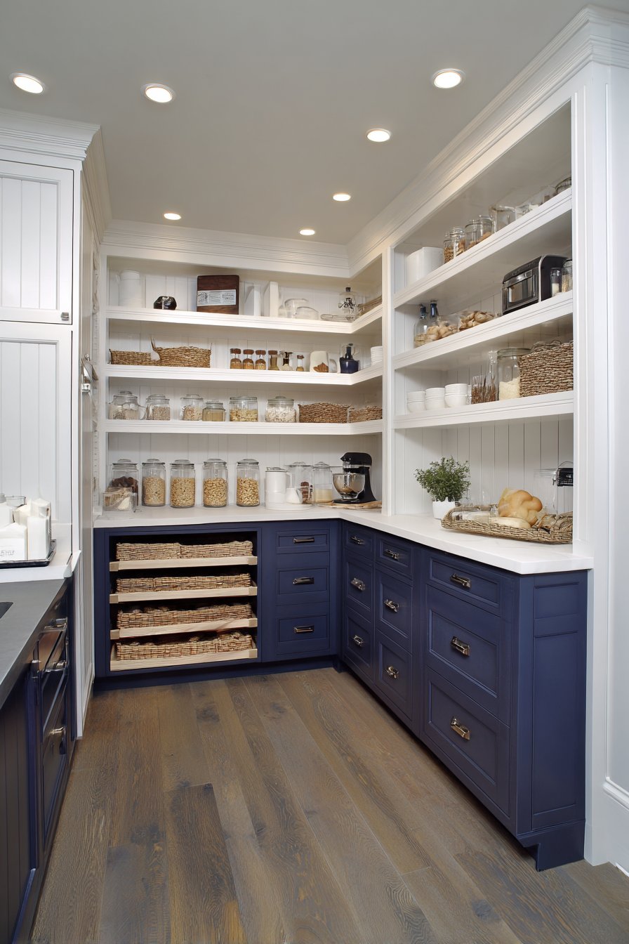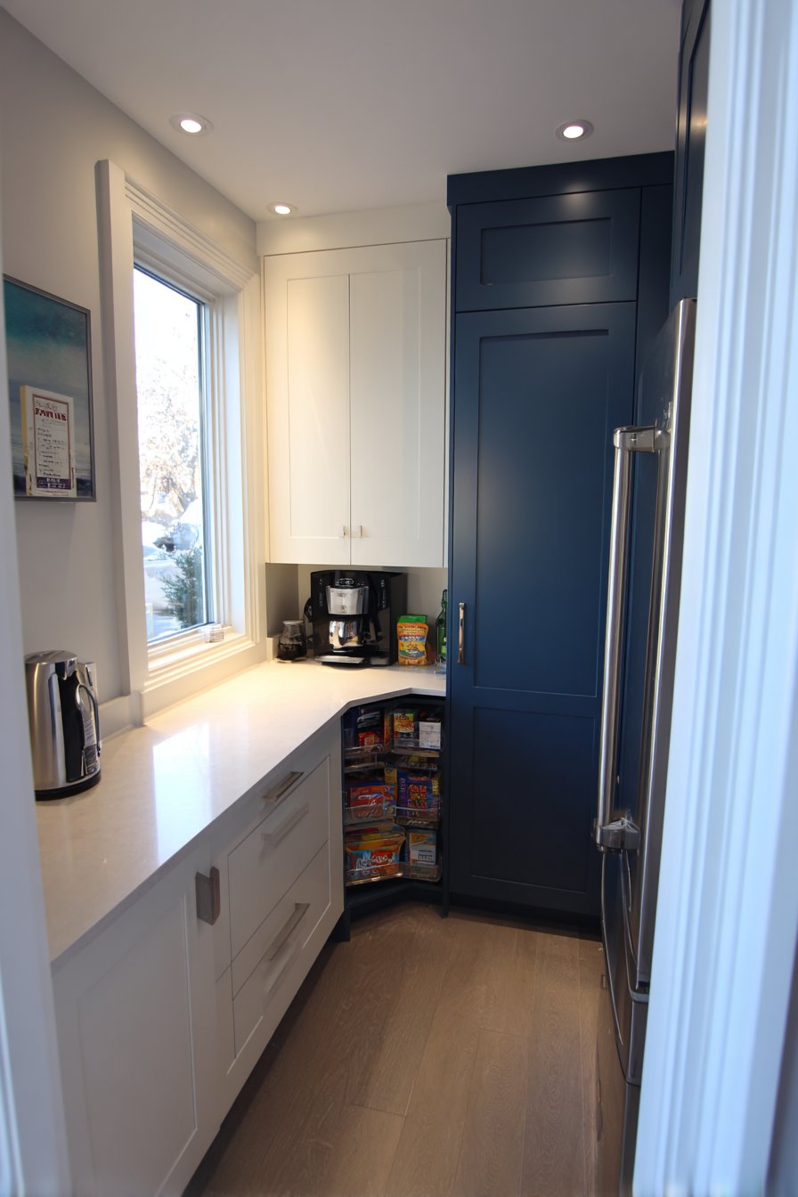 Recessed lighting in the ceiling provides even illumination throughout the pantry. The flush-mounted fixtures maintain clean ceiling lines. Wide-angle photography captures the cohesive design and thoughtful storage solutions. Professional lighting highlights color contrast and functional elements. This transitional style bridges traditional and contemporary aesthetics successfully.