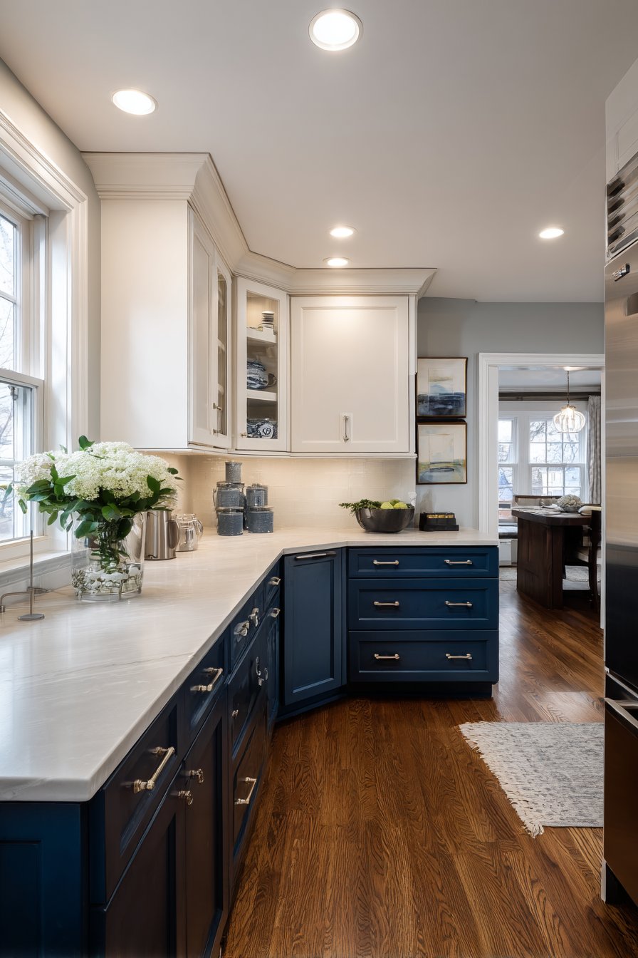 Navy blue lower cabinets paired with white uppers create striking visual interest. The two-tone approach adds depth without overwhelming the space. This color combination works beautifully along both walls. Quartz countertops in the corner provide durable workspace. The engineered stone resists stains and scratches better than natural alternatives.
