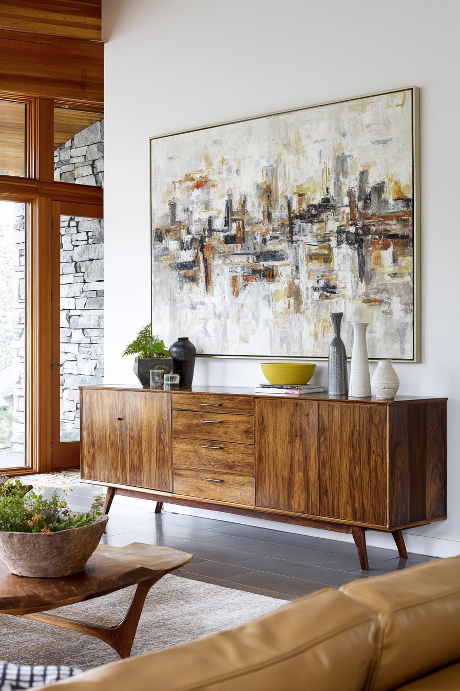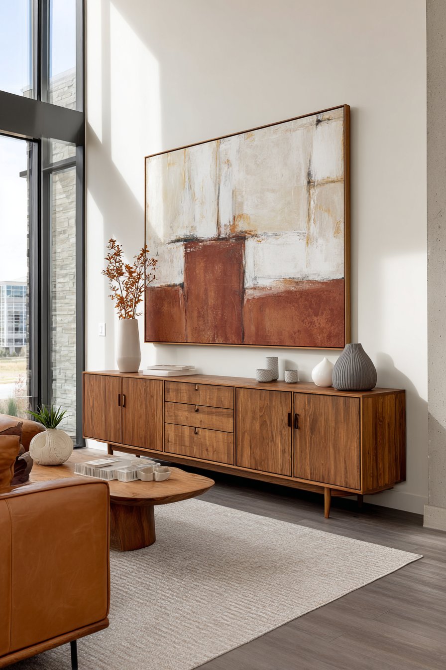 The low-profile credenza provides functional storage beneath the dramatic artwork. Its walnut finish adds warmth to the contemporary aesthetic. The wood grain patterns complement the organic shapes in the abstract painting. This furniture piece grounds the vertical wall treatment with horizontal balance.