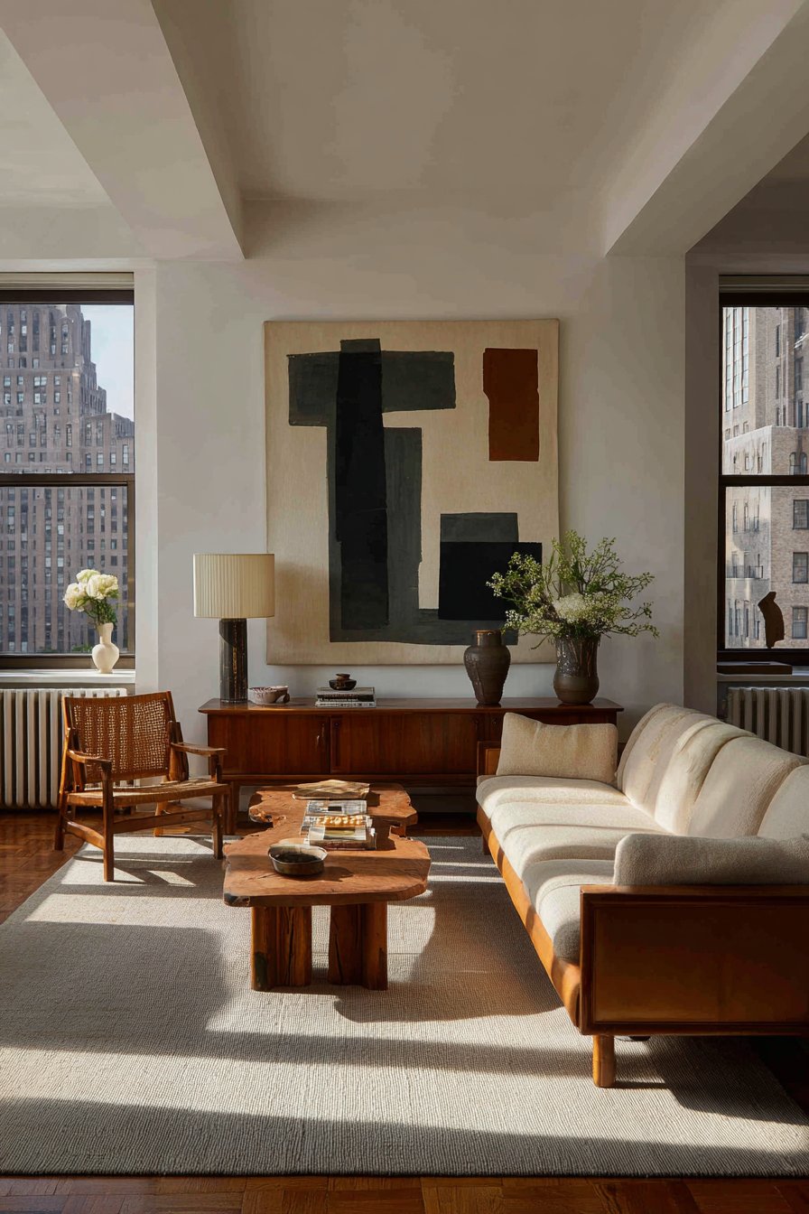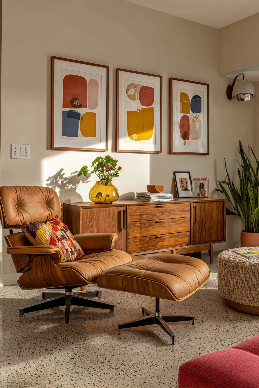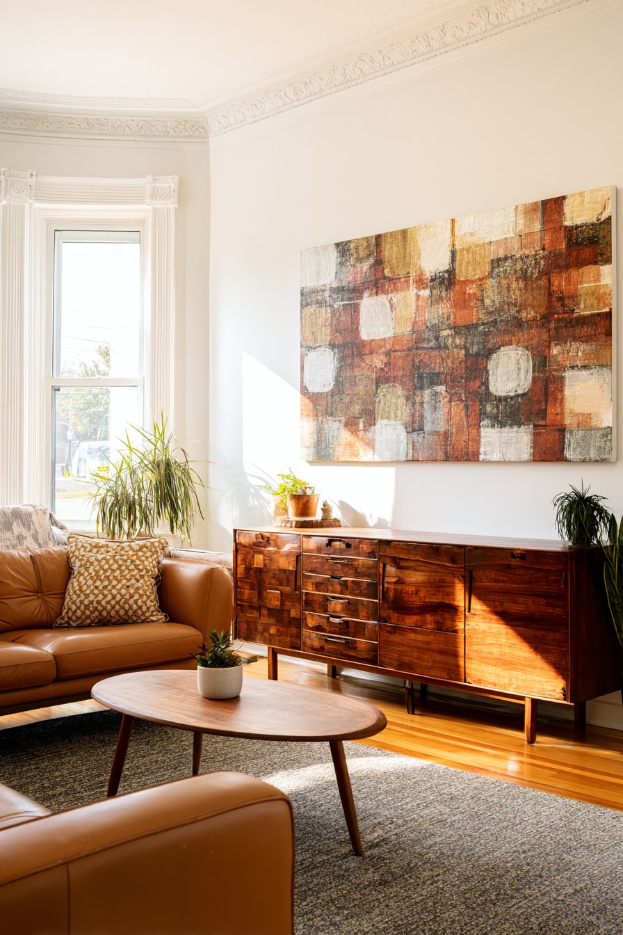 Mid-century modern furnishings complete this cohesive design scheme. A camel leather sofa offers comfortable seating with timeless appeal. The organic wood coffee table introduces natural elements. These pieces create conversation areas that feel both stylish and inviting.