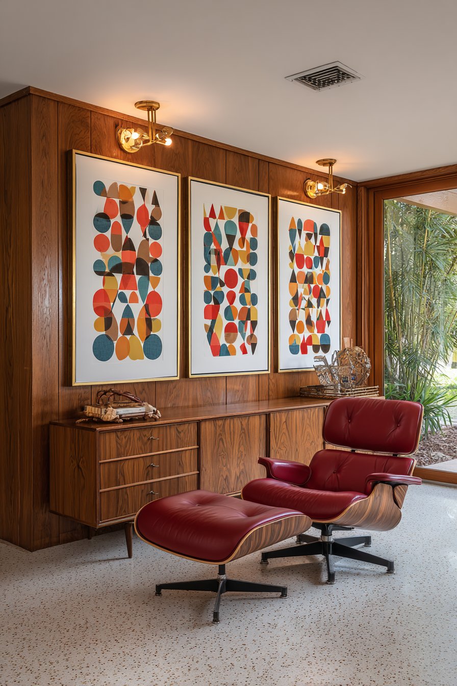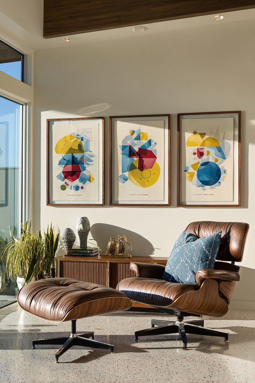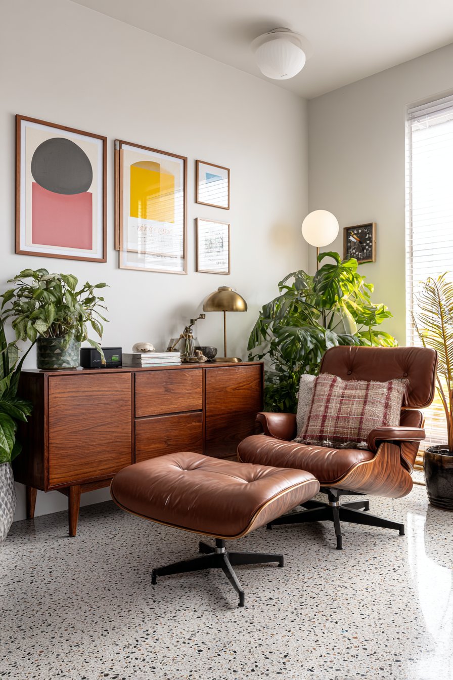 Mid-century modern furnishings complete this cohesive design scheme. A camel leather sofa offers comfortable seating with timeless appeal. The organic wood coffee table introduces natural elements. These pieces create conversation areas that feel both stylish and inviting.