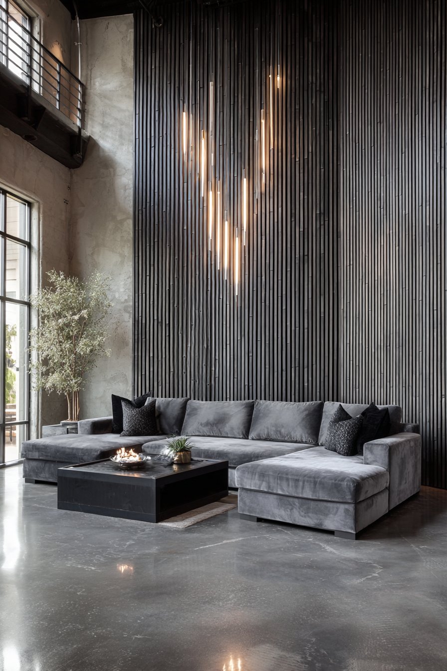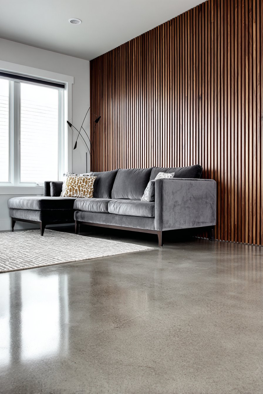 Exposed ceiling beams echo the horizontal-vertical interplay throughout. Natural pine flooring adds warmth underfoot. A stone gray linen sofa offers comfortable seating. These neutral tones allow the textured wall treatment to shine.