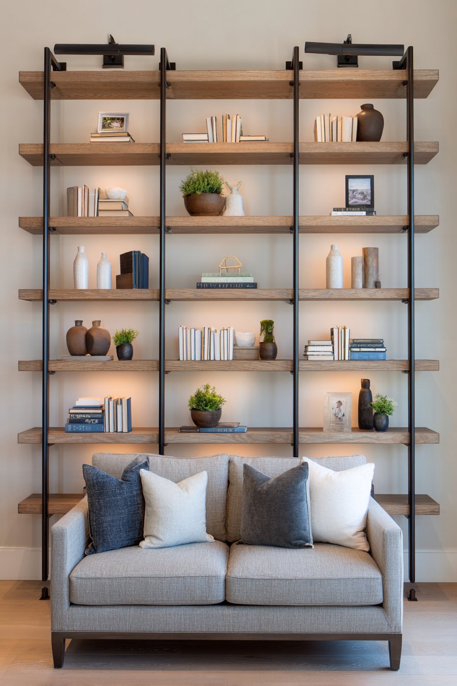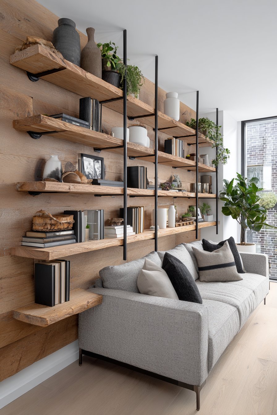 - Install shelving asymmetrically for an organic industrial feel