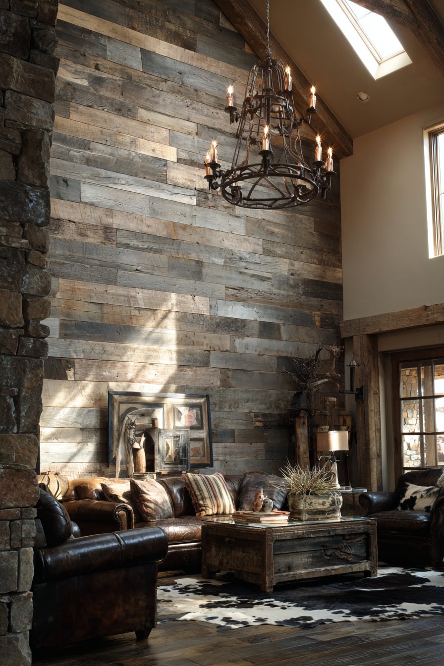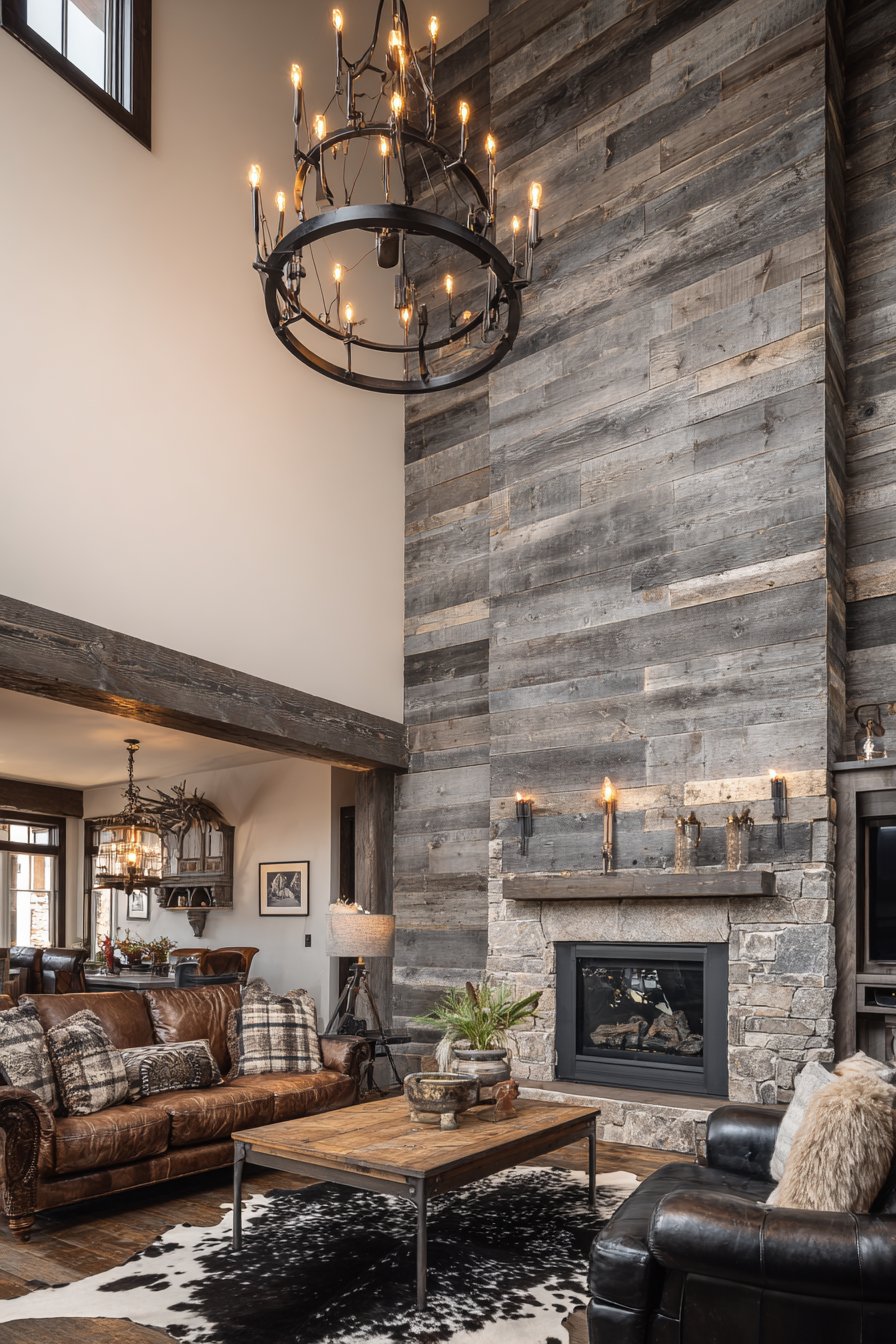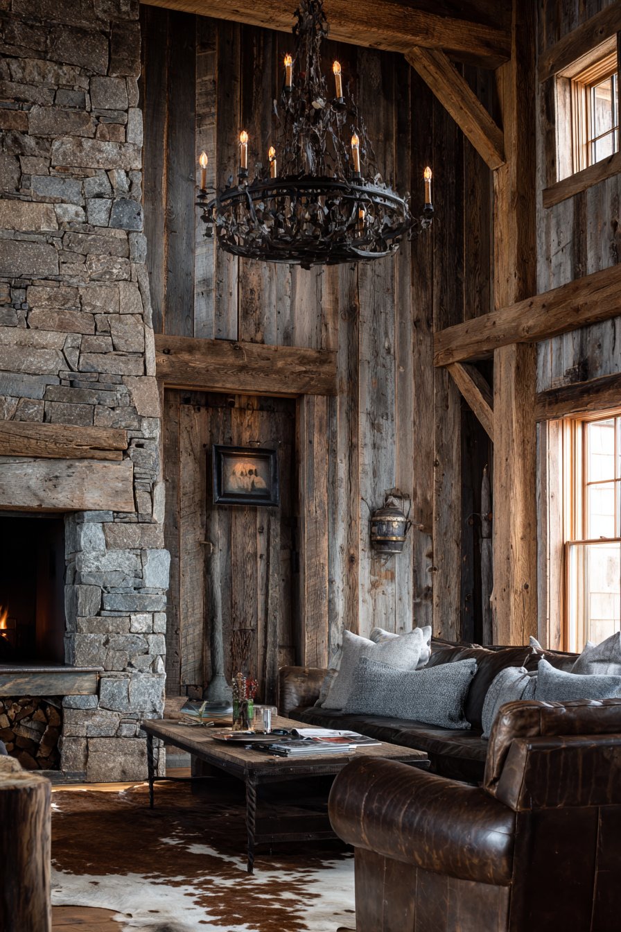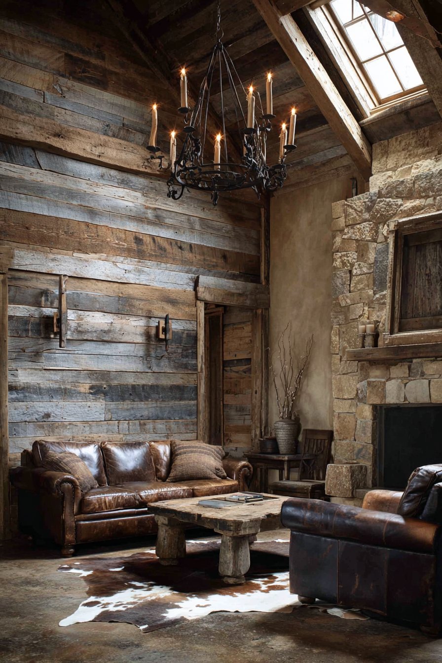 A wrought iron chandelier with candle-style bulbs provides illumination. The fixture’s industrial character complements rustic wood textures. Distressed leather furniture and cowhide rug establish the theme. Stone fireplace on the adjacent wall adds warmth.