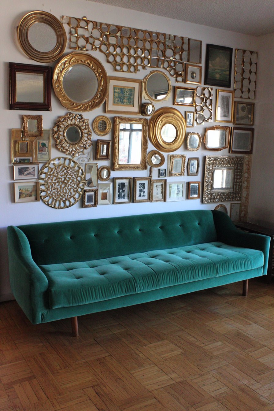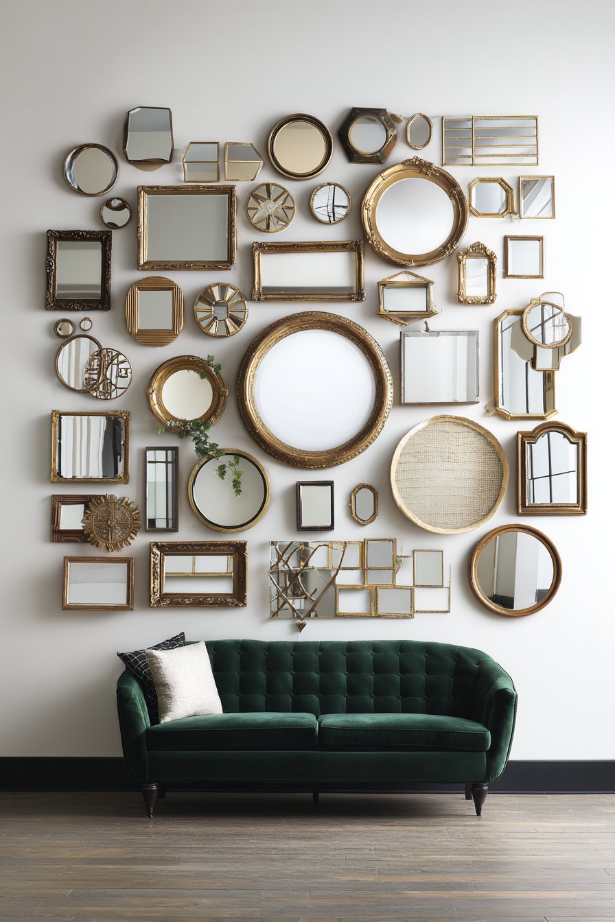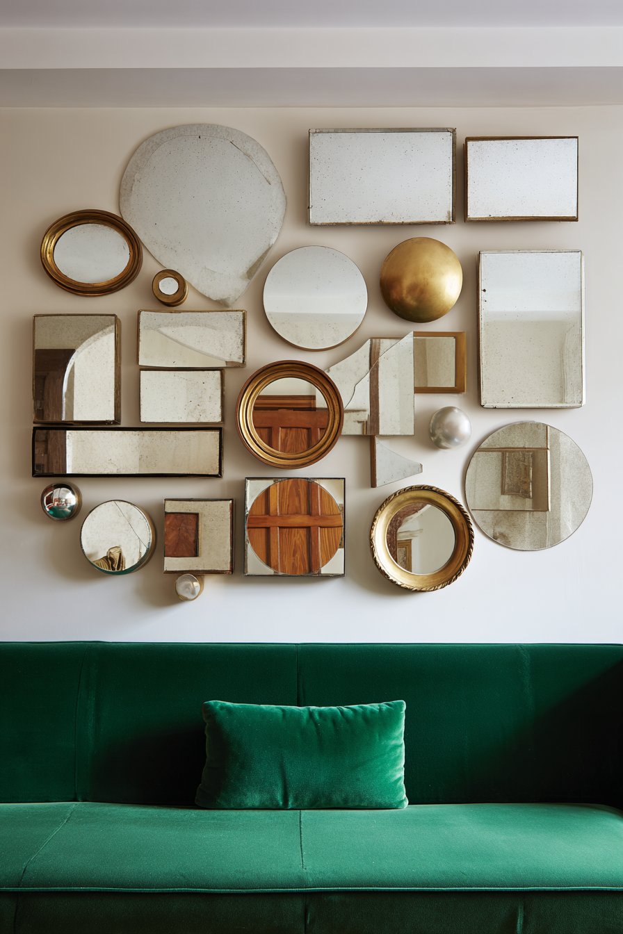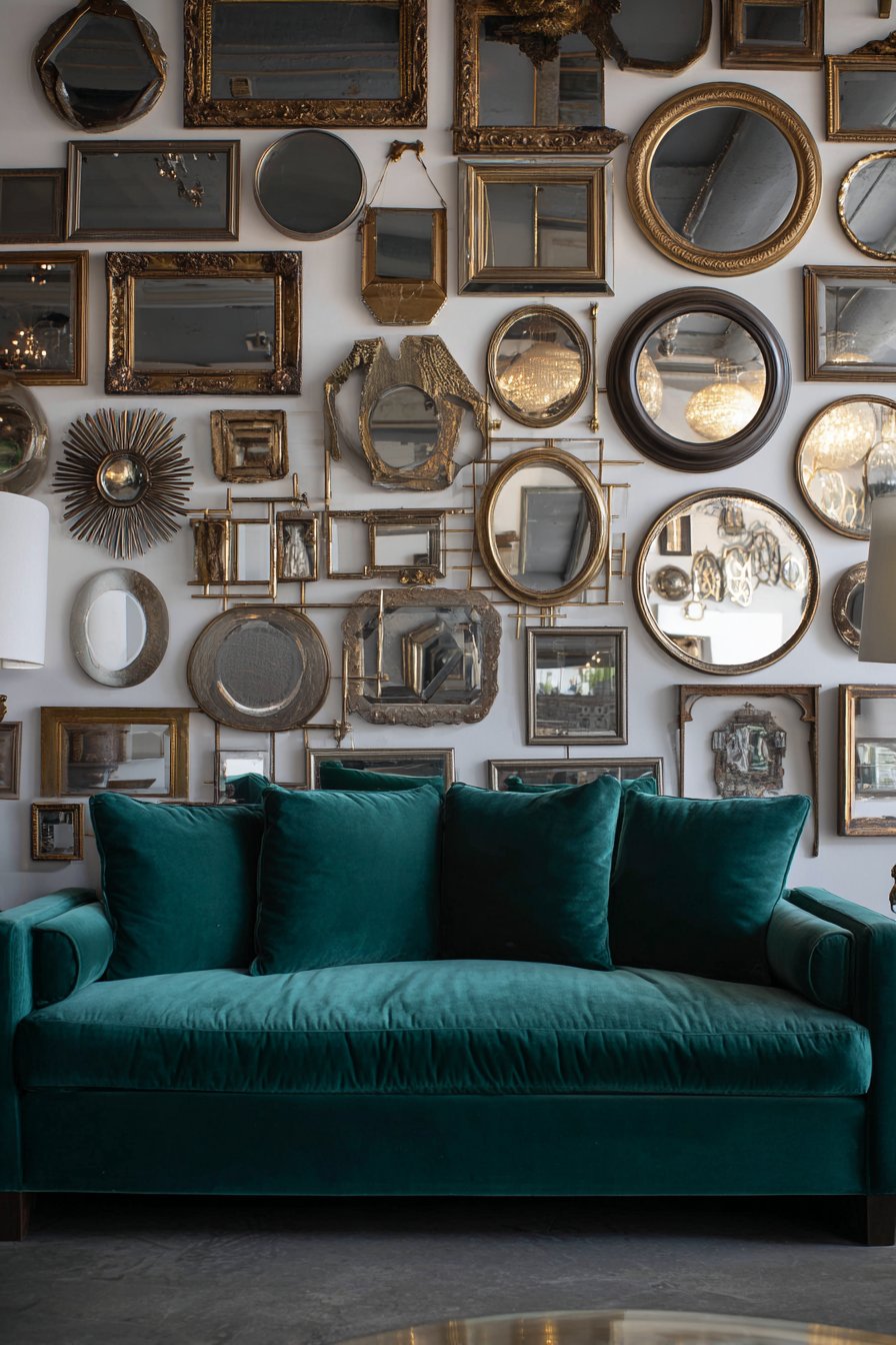 The clustered arrangement covers approximately eighty square feet. Mirrors reflect various room elements throughout the space. Natural light multiplies through reflective surfaces. An emerald green velvet sofa provides jewel-tone anchor below.