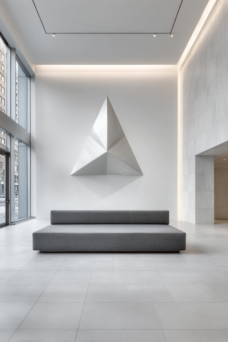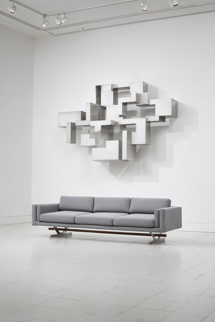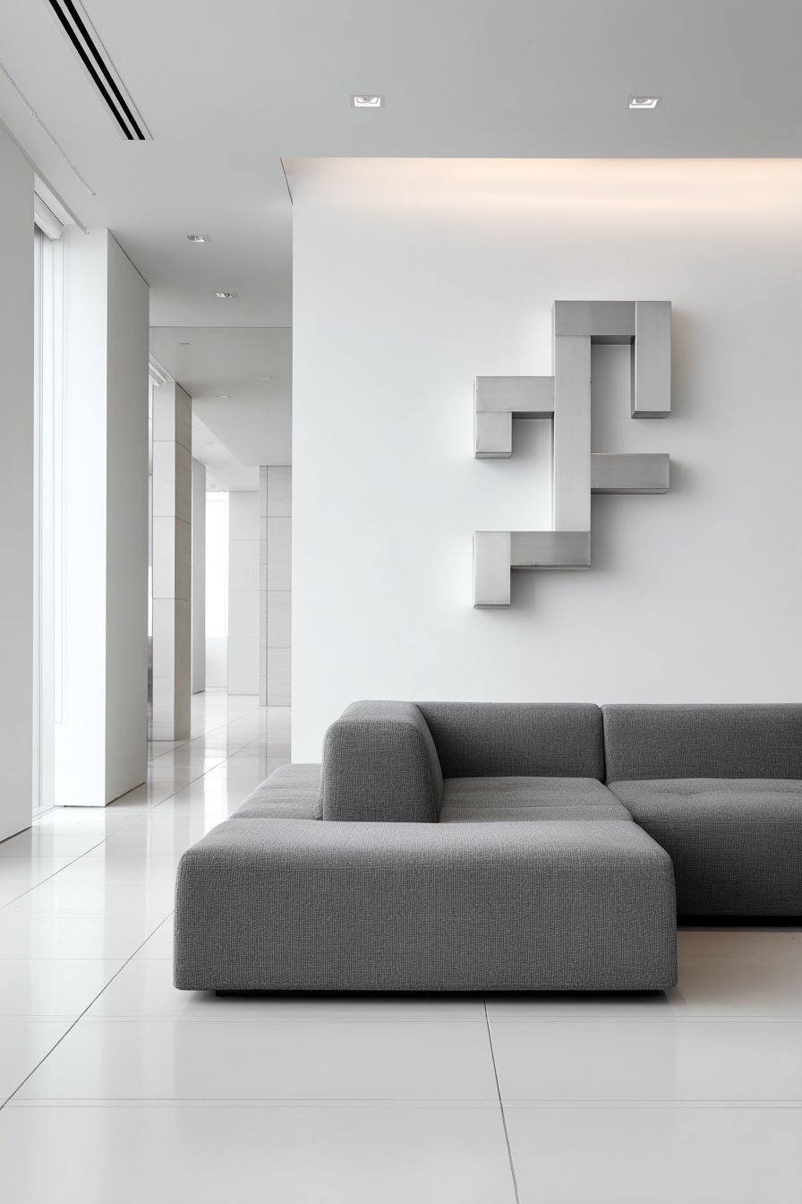 Minimalist drama centers on three-dimensional metal sculpture. Brushed stainless steel creates abstract geometric forms. The five-by-seven foot piece commands immediate attention. Shadows and depth emerge through sculptural angles.