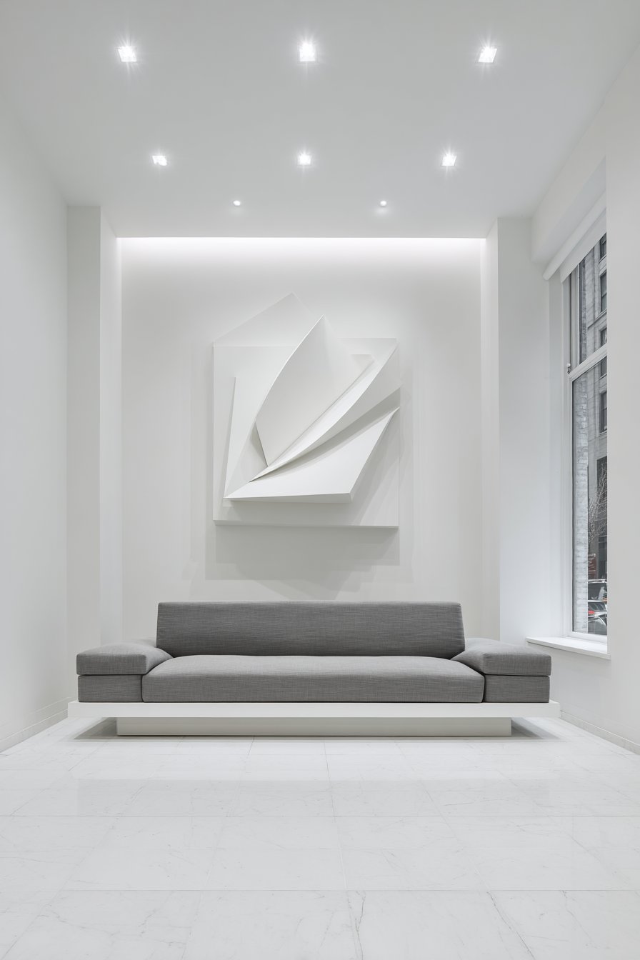 A low-profile gray platform sofa offers clean-lined seating below. Polished white porcelain tile flooring enhances the gallery atmosphere. Hidden LED perimeter lighting creates dramatic ambiance. The monochromatic palette emphasizes sculptural form over color.