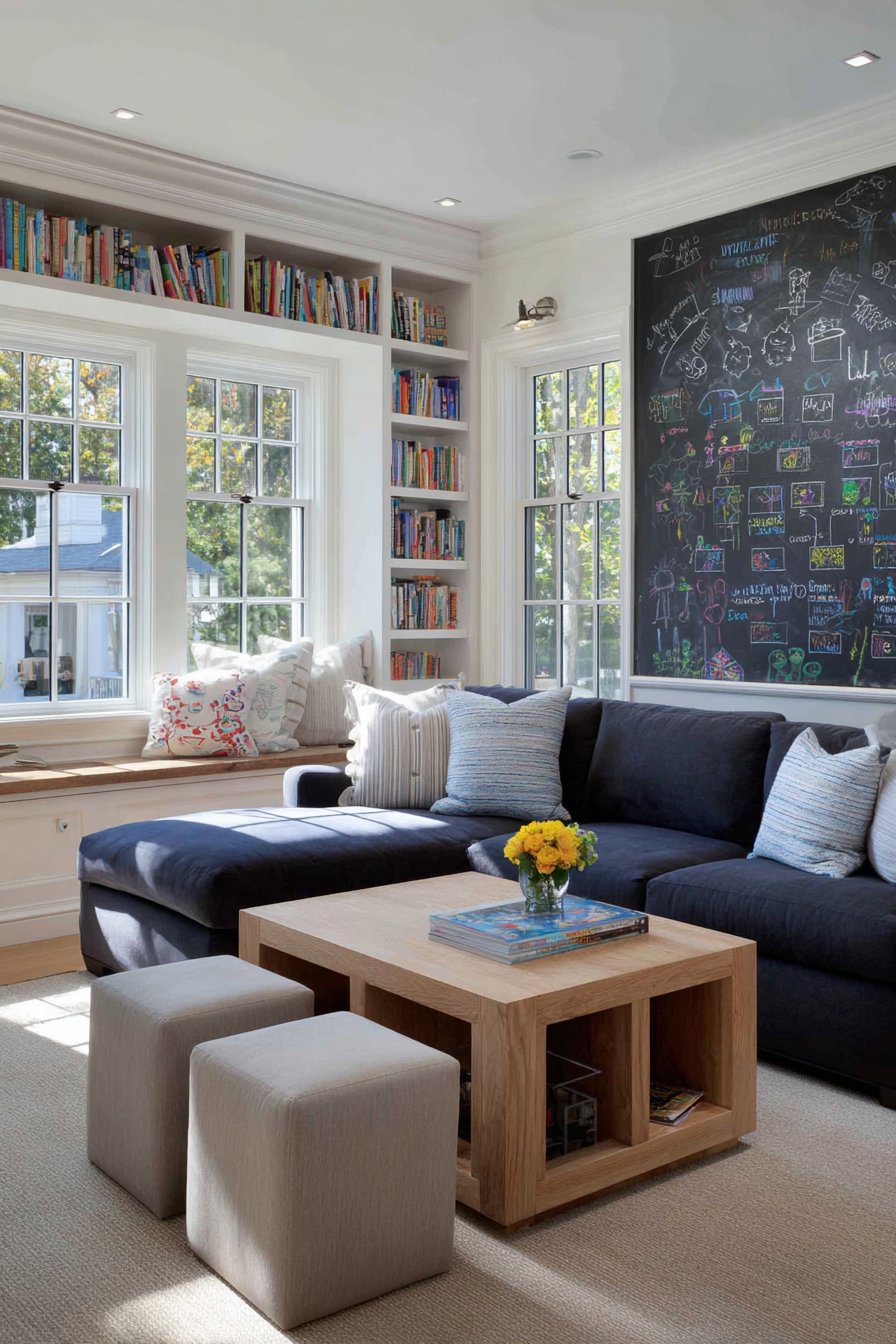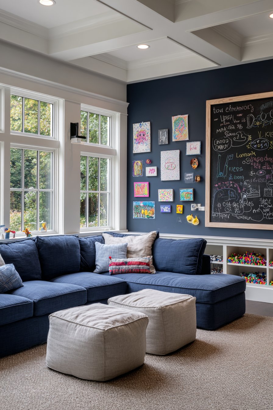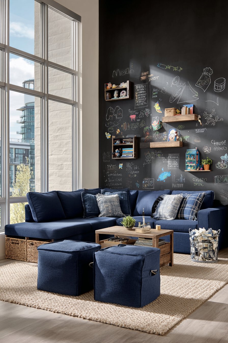 A durable navy performance fabric sectional withstands family use. Storage ottomans provide toy containment nearby. Built-in cubbies below the chalkboard organize chalk supplies. This practical design supports daily family life.