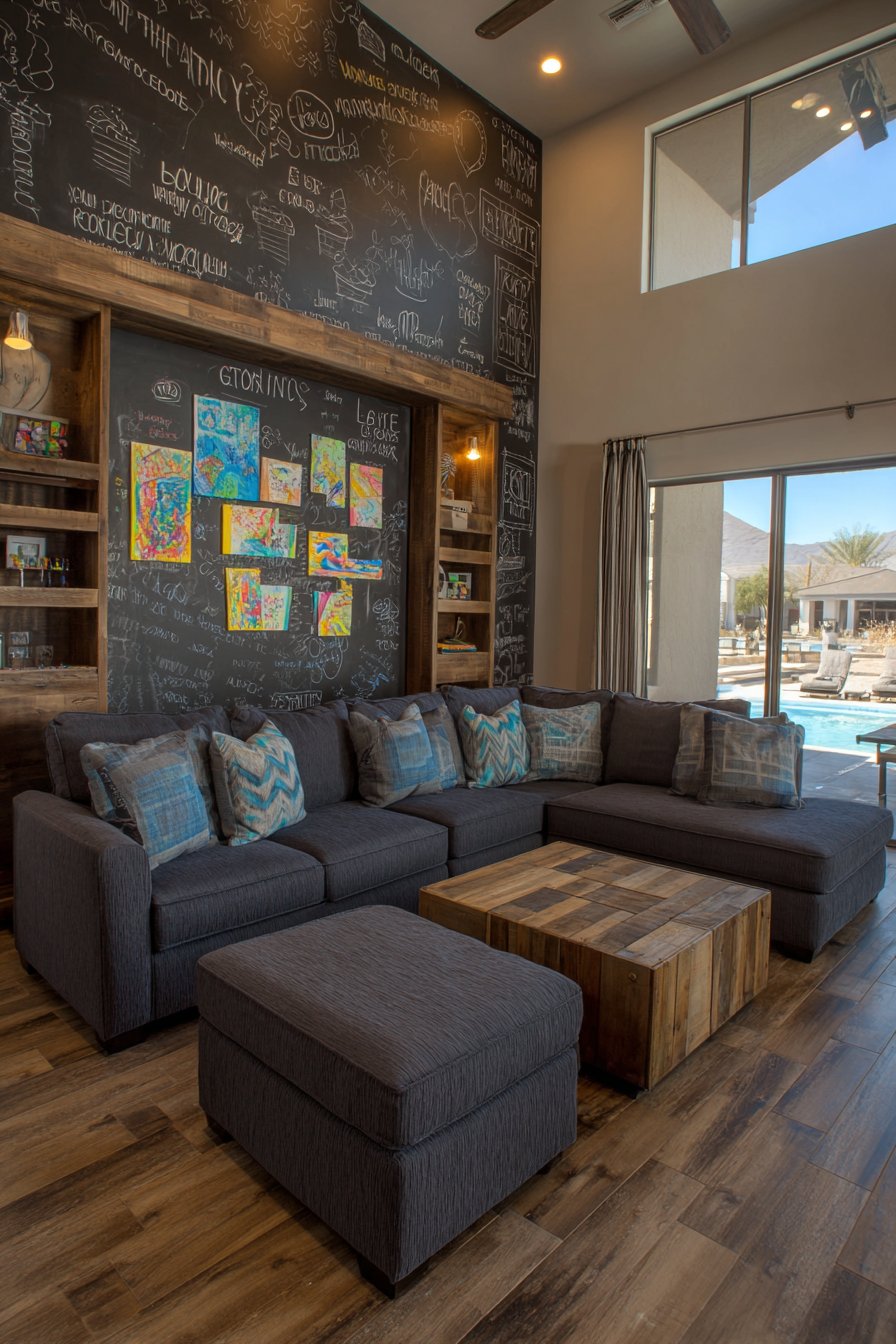 Family-friendly functionality embraces magnetic chalkboard surfaces. The eight-by-six foot surface encourages creative expression. Natural wood trim frames the interactive area. Children’s chalk artwork and calendar notes display proudly.