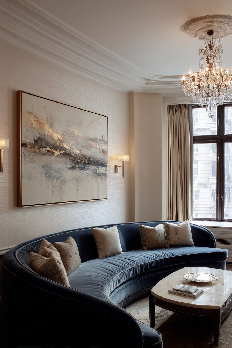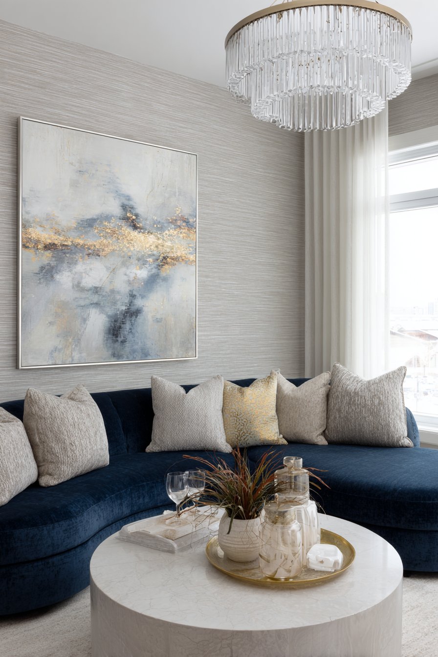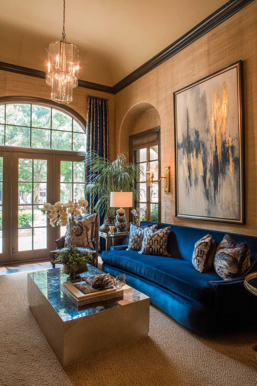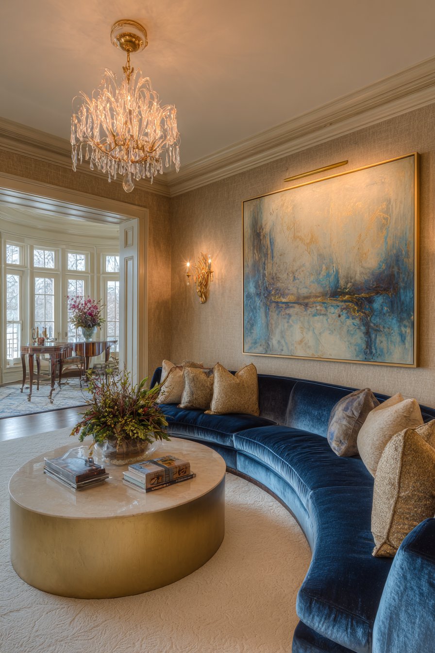 Gold leaf accents in the painting echo wallpaper metallics. A curved velvet sofa in sapphire blue adds jewel-tone drama. The marble coffee table introduces natural stone luxury. Crystal chandelier provides ambient illumination overhead.