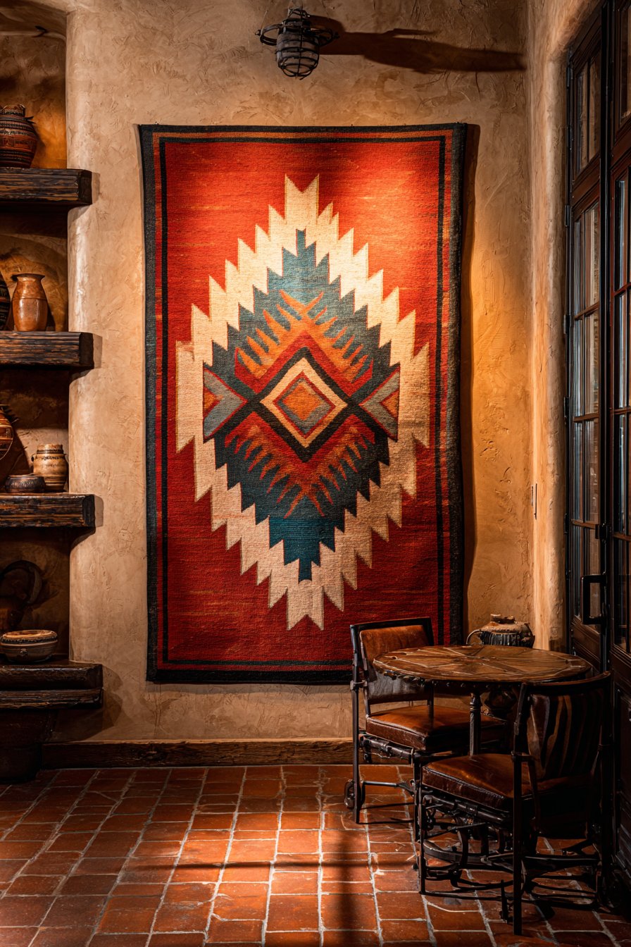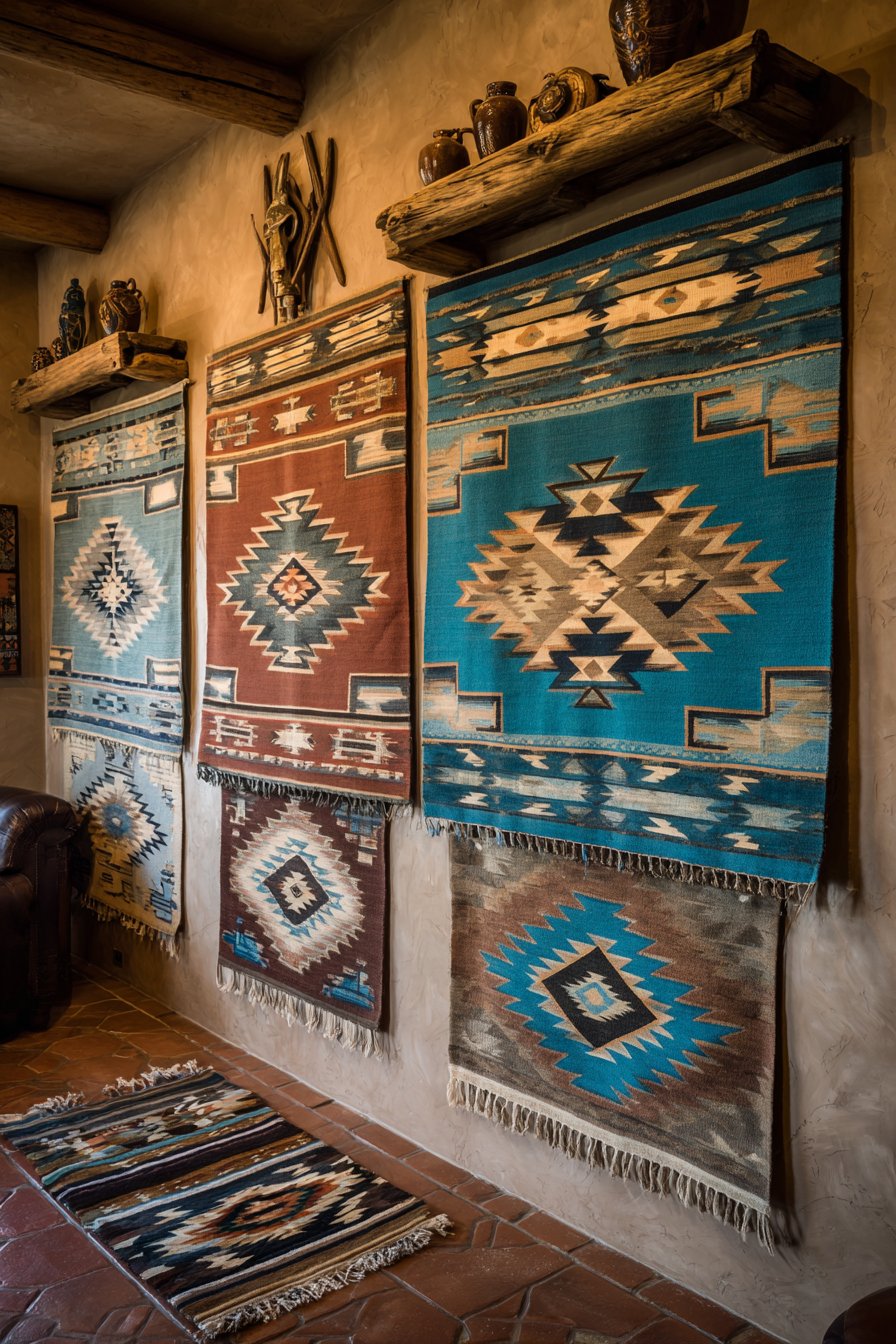 Regional character is celebrated through authentic Native American textiles. Rustic wooden ledge shelves display at staggered heights. The largest textile measures four-by-six feet. Navajo-inspired geometric patterns feature terracotta, turquoise, and cream.