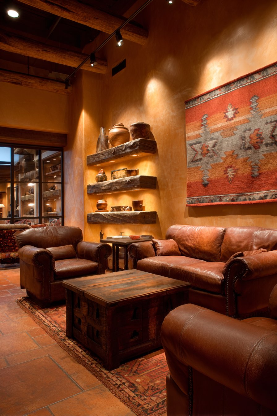 Adobe-style plaster walls provide warm sand-tone backdrop. Leather furniture with wrought iron accents honors regional heritage. Terracotta tile flooring grounds the Southwestern aesthetic. Handcrafted pottery adds dimensional texture throughout.