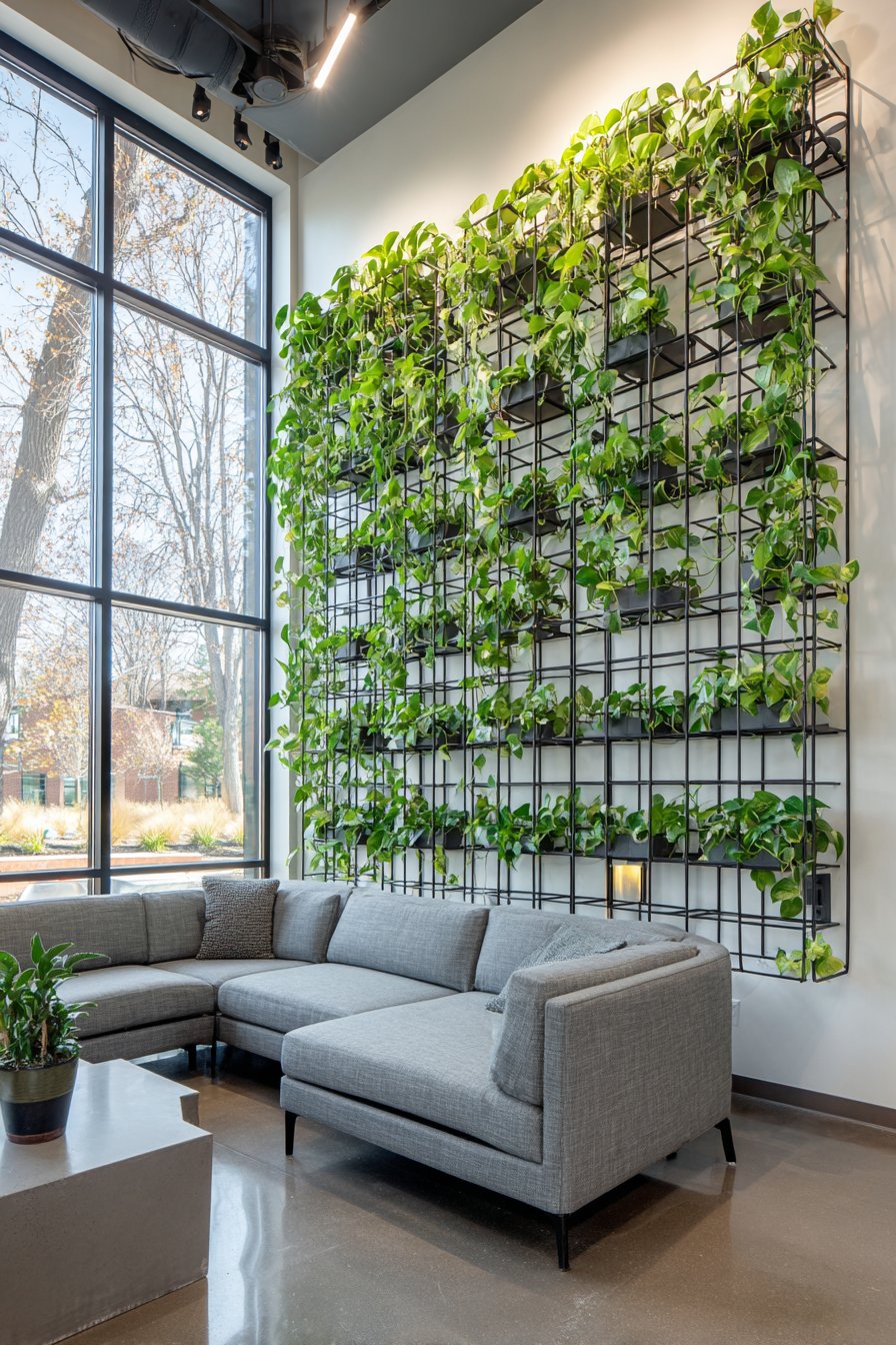 Biophilic design flourishes through modular plant wall systems. Matte black metal frames are arranged in geometric grid. The six-by-eight-foot installation creates vertical indoor garden. Trailing pothos, ferns, and philodendrons thrive together.