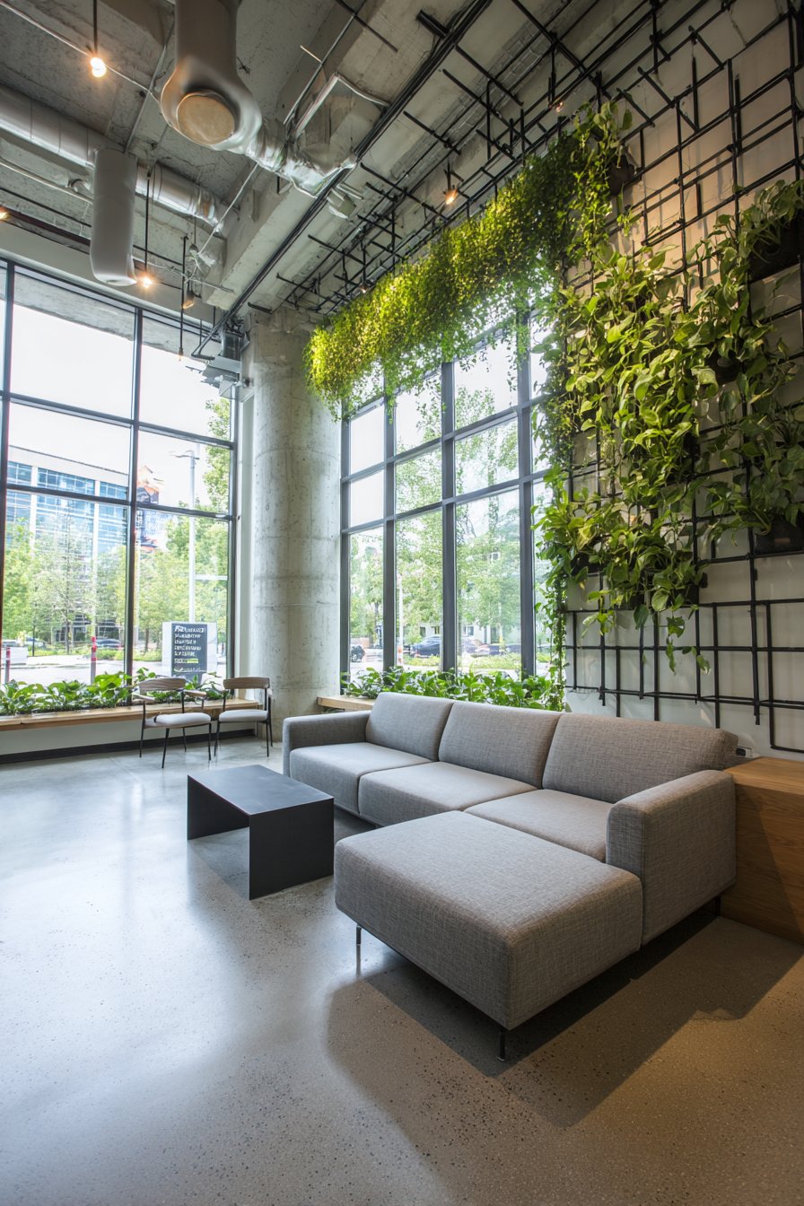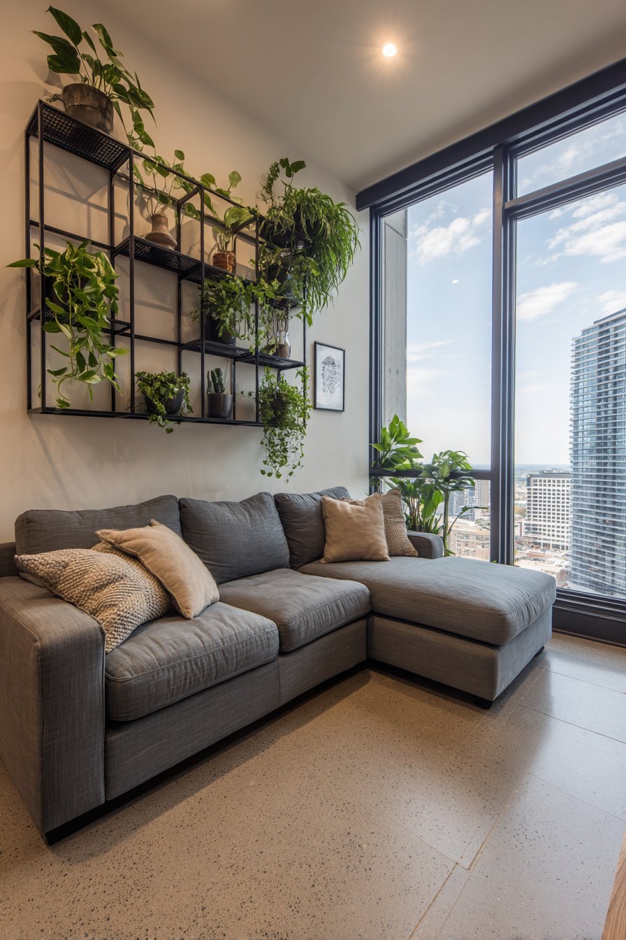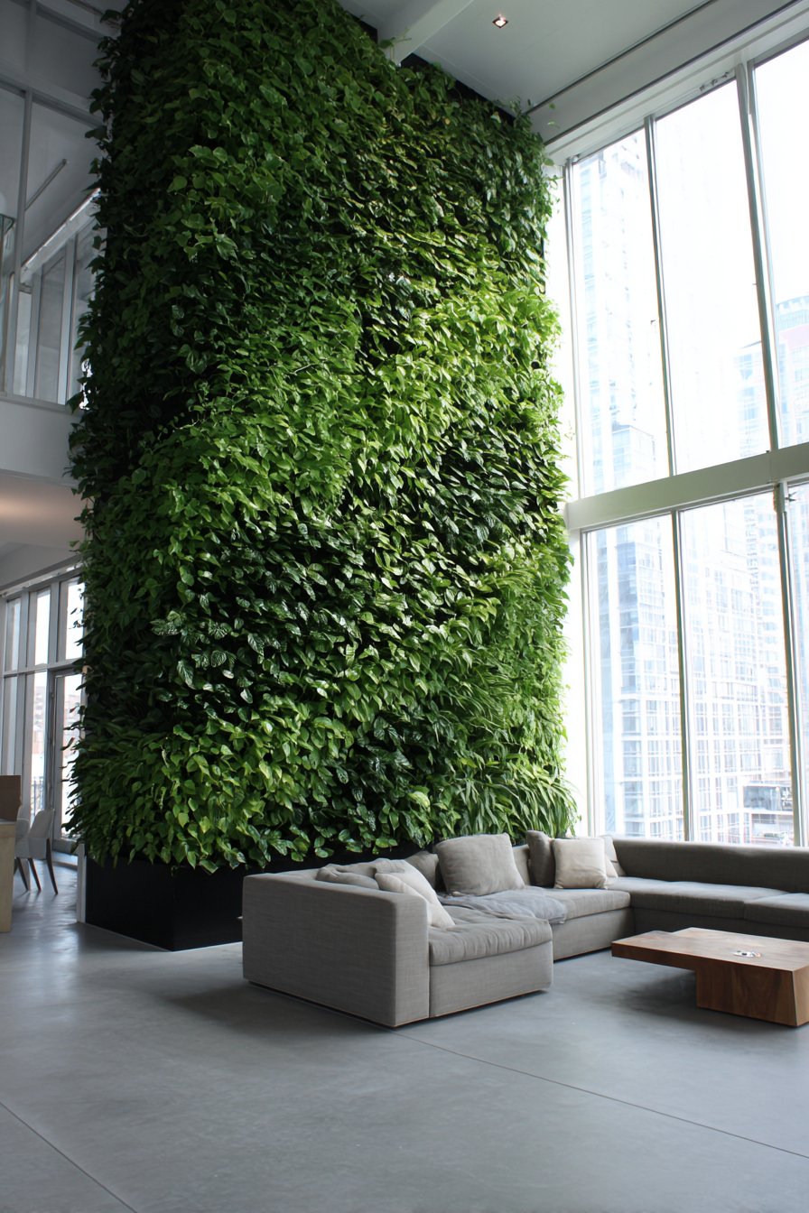 Integrated drip irrigation maintains plant health automatically. The system prevents water damage and simplifies maintenance. A modern gray sectional provides a comfortable viewing position. Abundant natural light from floor-to-ceiling windows supports photosynthesis.