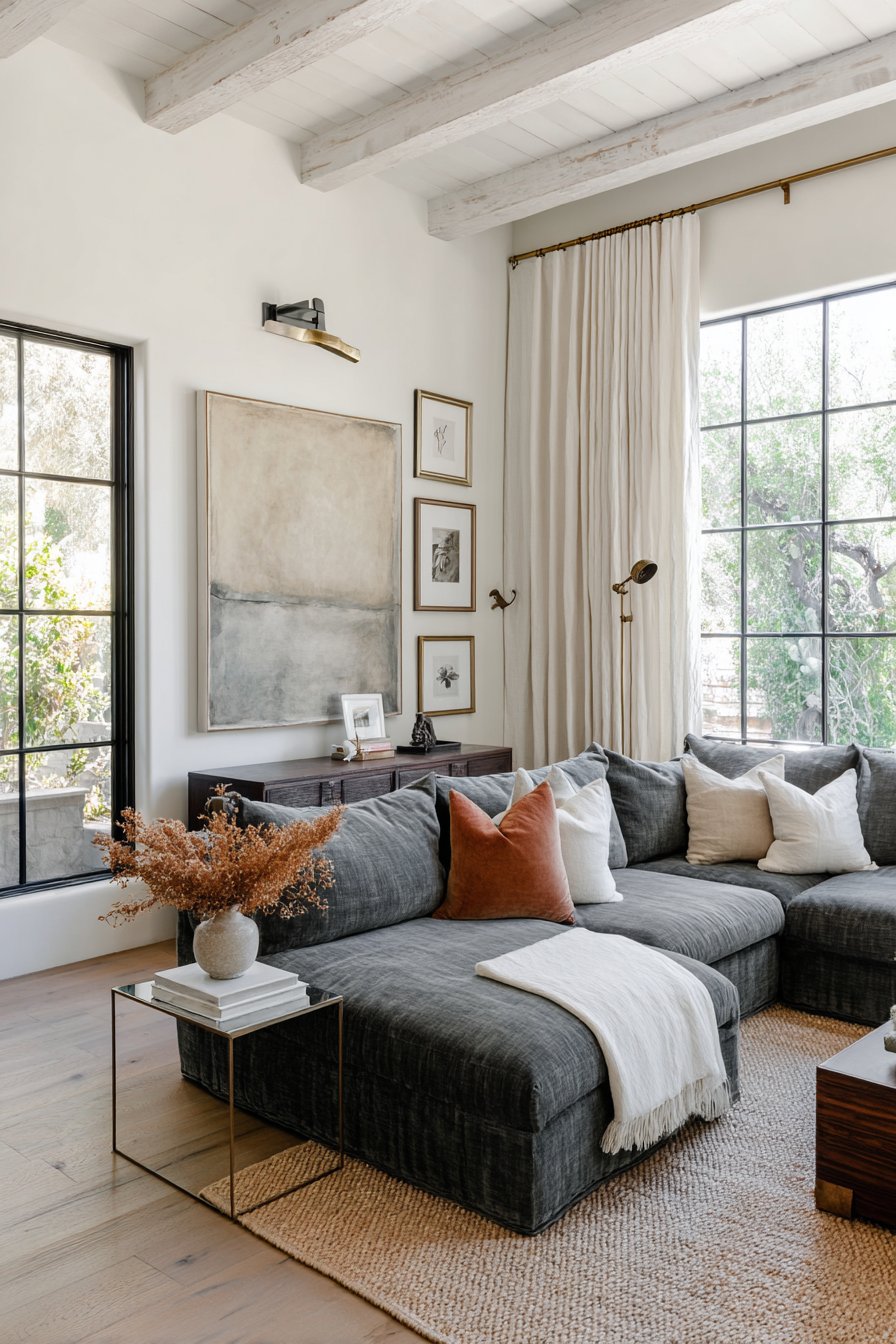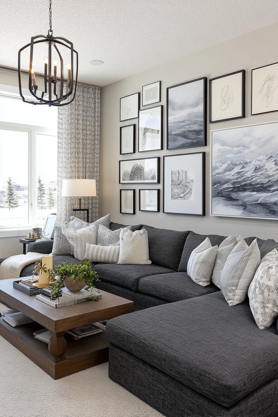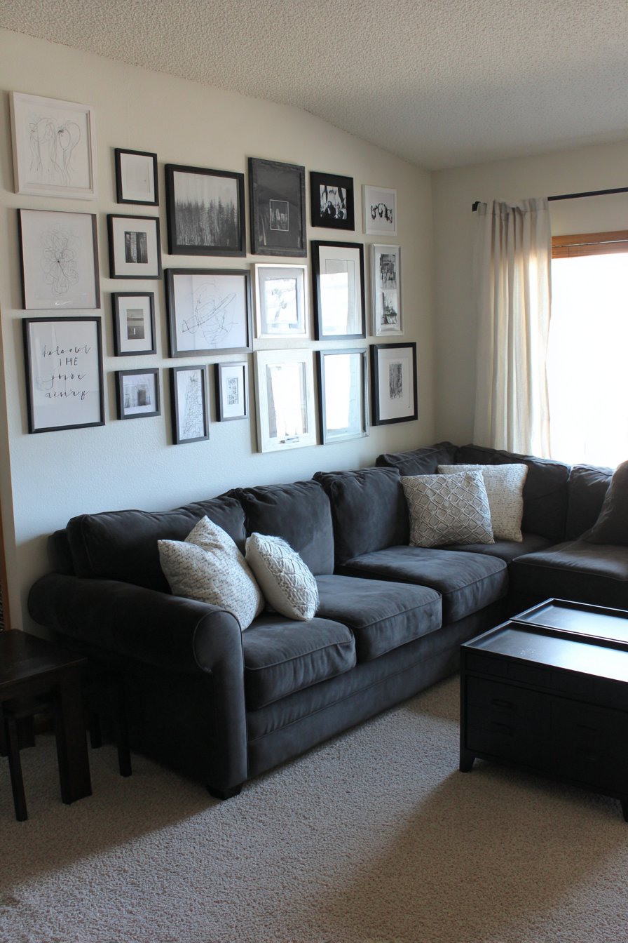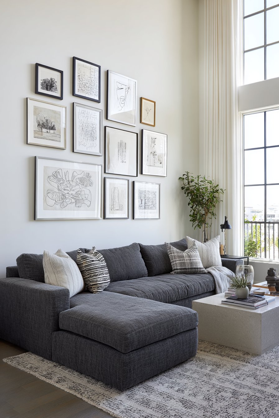 A charcoal sectional sofa provides the perfect foundation below. Its neutral tone allows the gallery wall to shine. The low back height ensures the artwork remains visible. Natural daylight creates depth through subtle frame shadows throughout the day.