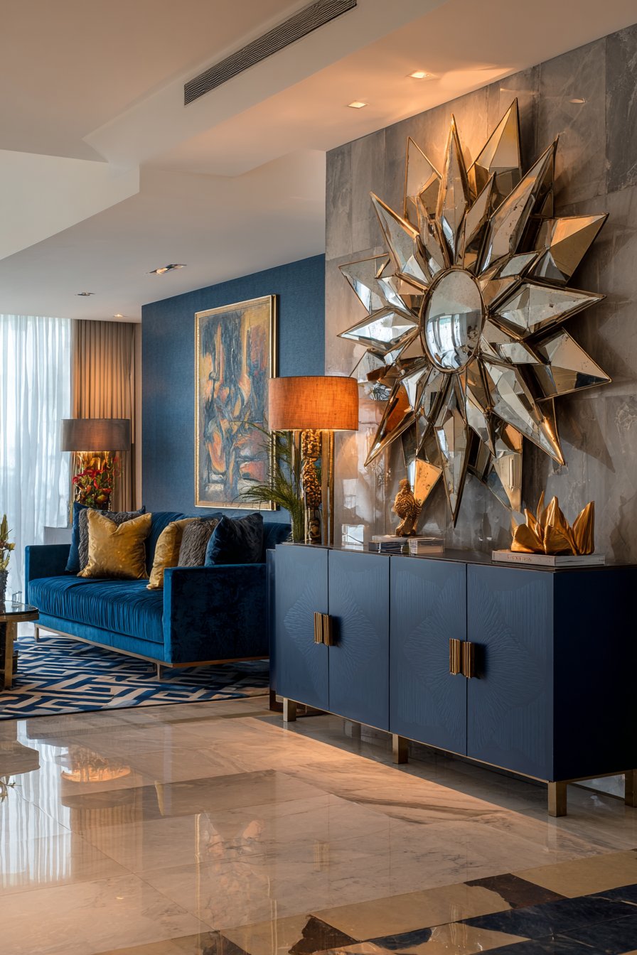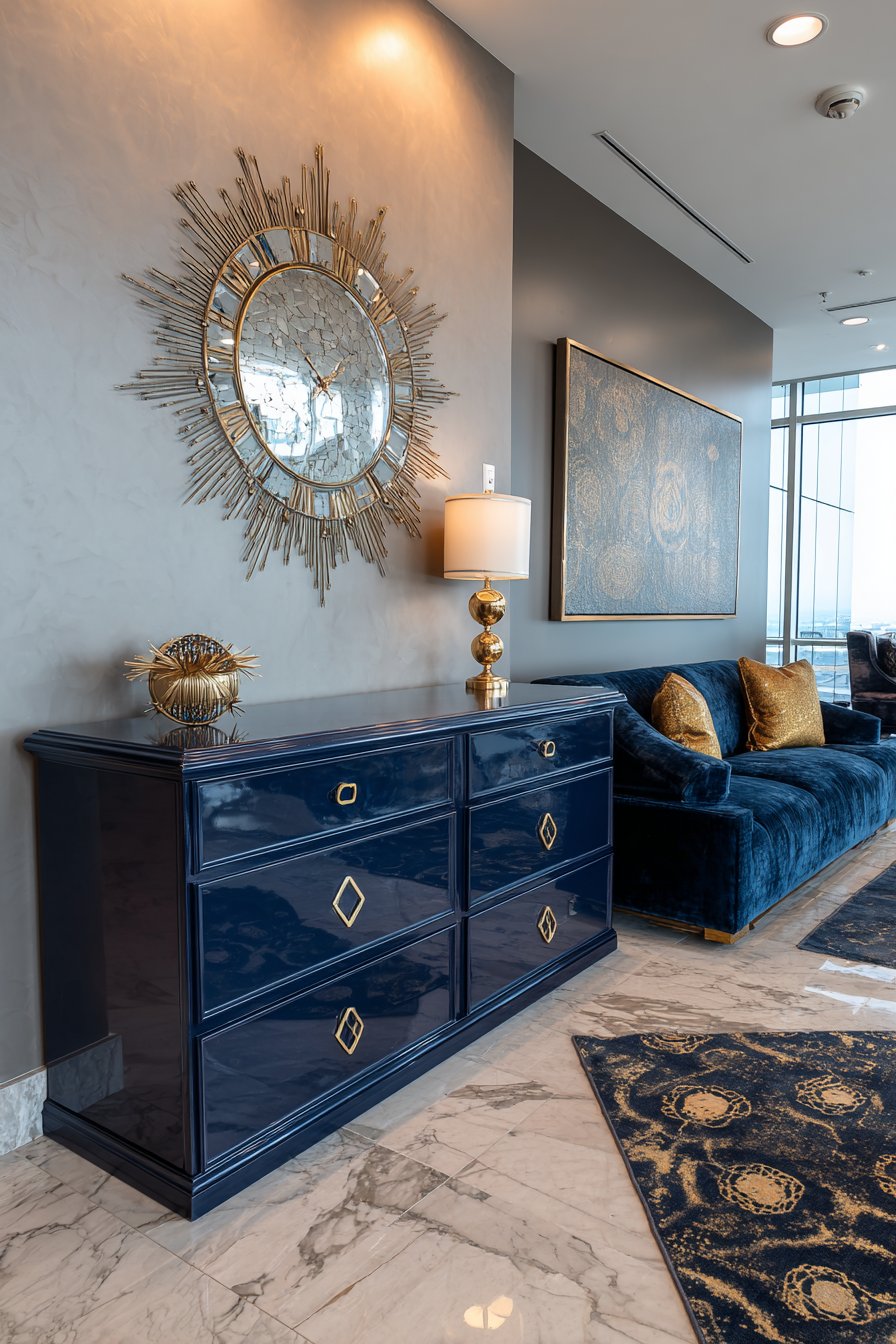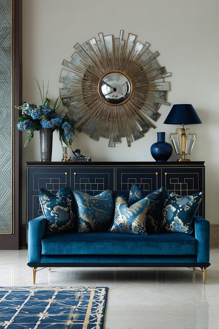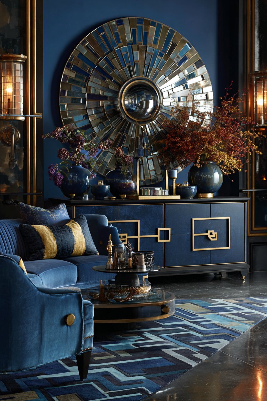 The mirror hangs above a lacquered navy credenza. Brass geometric drawer pulls echo the mirror’s metallic finish. Velvet furniture in peacock blue establishes 1920s aesthetic. Gold accent pillows add complementary metallic warmth.