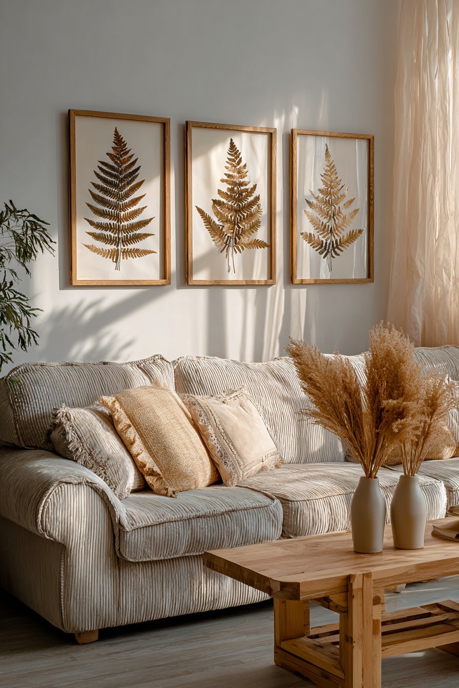 Minimalist design shines through three large-scale botanical prints. Natural wood frames contain pressed fern specimens on cream backgrounds. The horizontal arrangement features eight inches between each piece. This creates rhythmic visual flow across the wall.