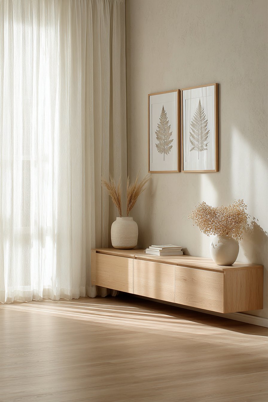 Soft morning light filters through sheer linen curtains nearby. The diffused illumination creates gentle shadows behind the frames. The cream backgrounds appear luminous in this natural light. This ethereal quality enhances the minimalist aesthetic throughout the space.