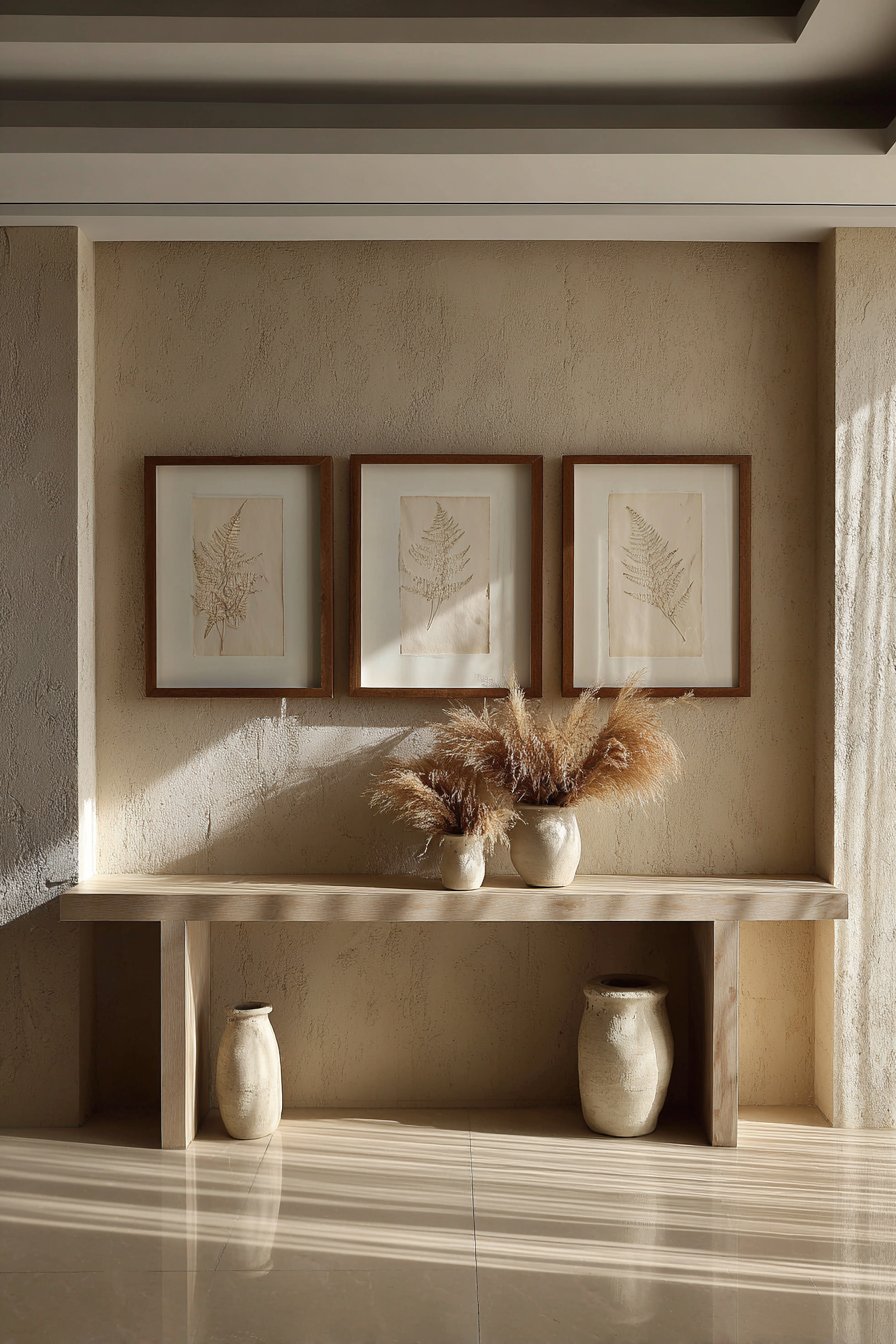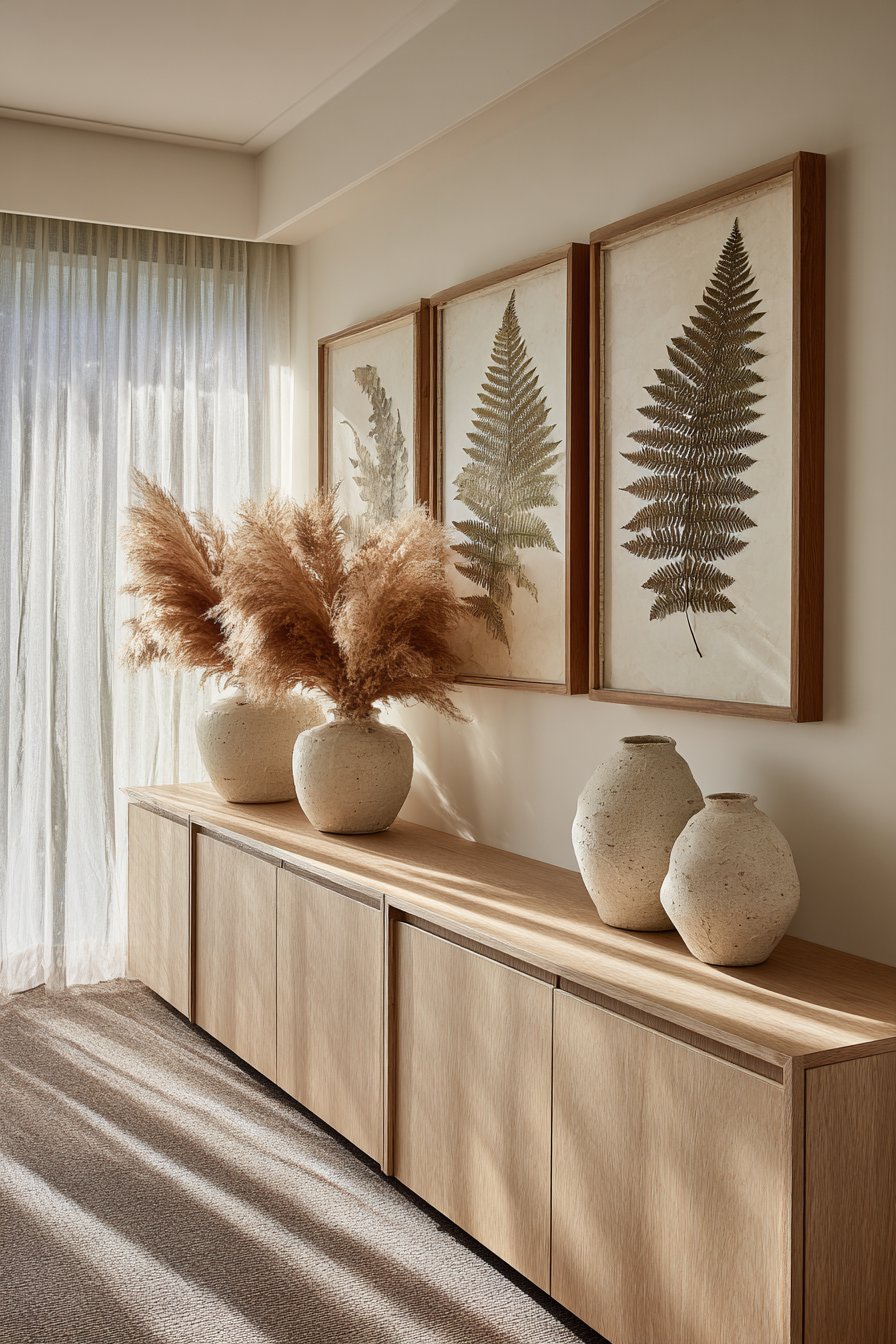 A light oak floating console table sits below the botanical artwork. The pale wood tone echoes the frame material perfectly. Ceramic vases hold dried pampas grass for organic texture. These natural elements reinforce the botanical theme beautifully.
