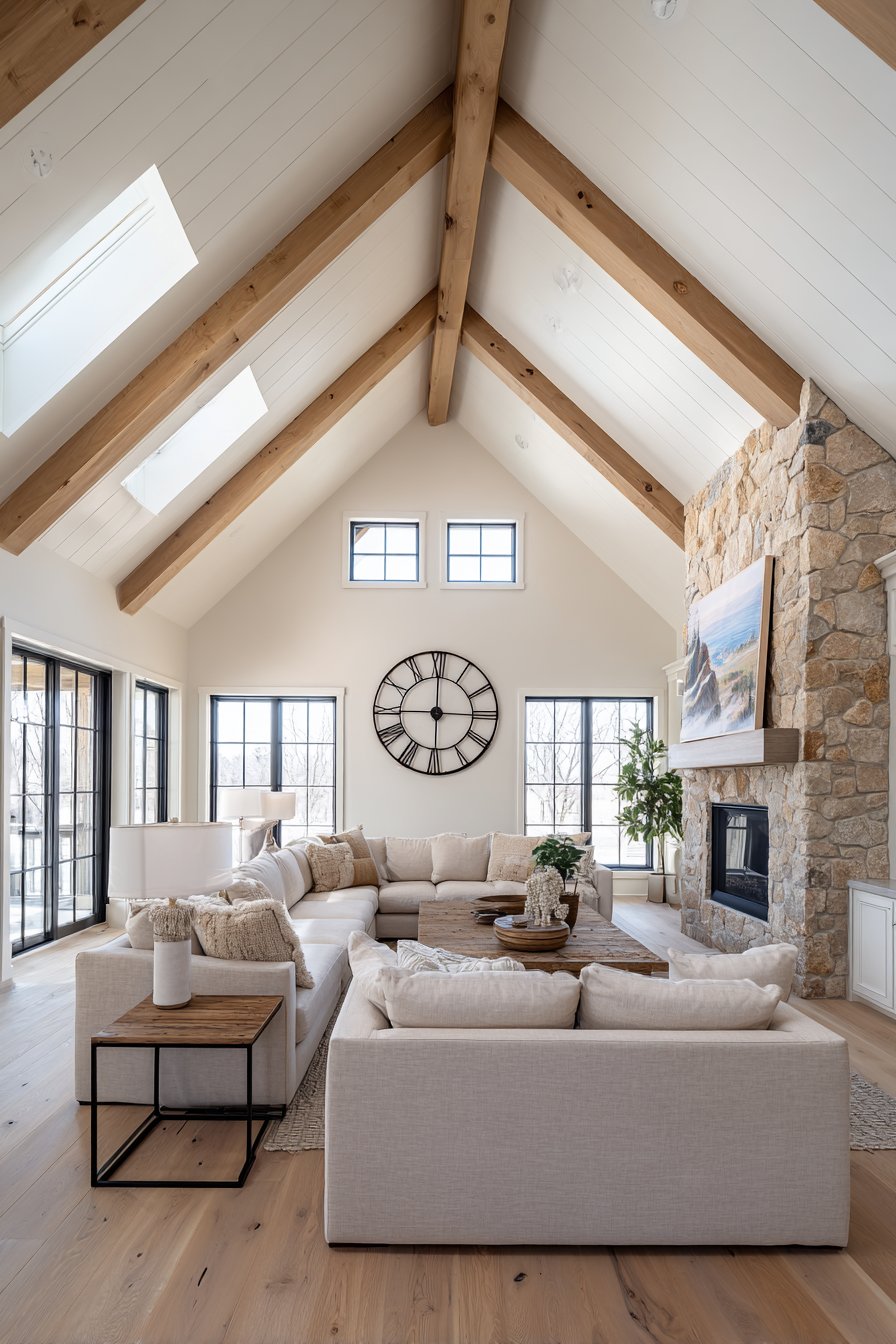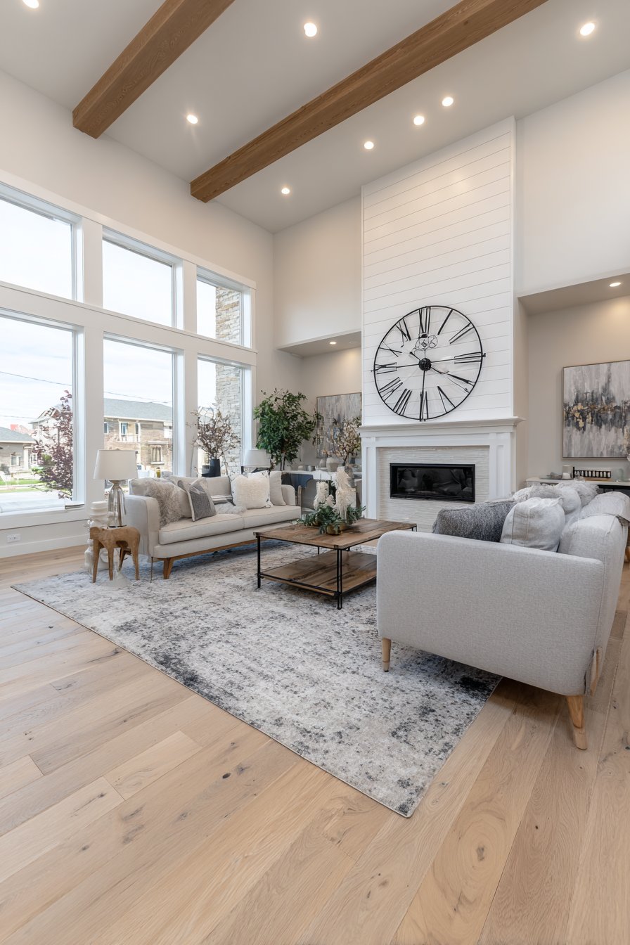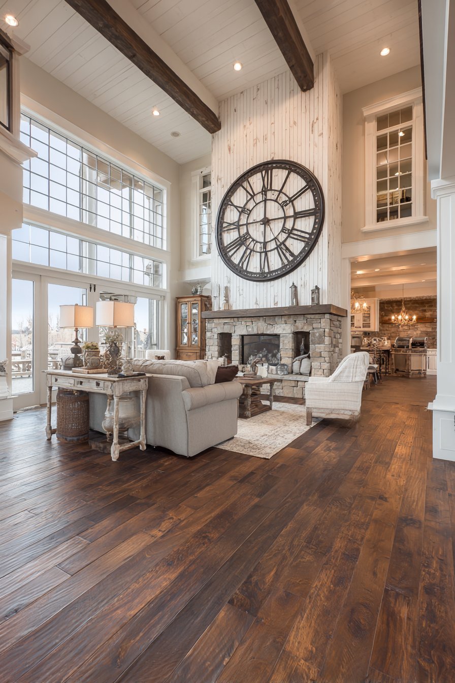 The thirty-six inch clock diameter ensures proper scale for the expansive wall. Its simple numerals and black finish create striking contrast. The industrial metal complements the rustic shiplap texture. This pairing balances refined and rugged design elements.