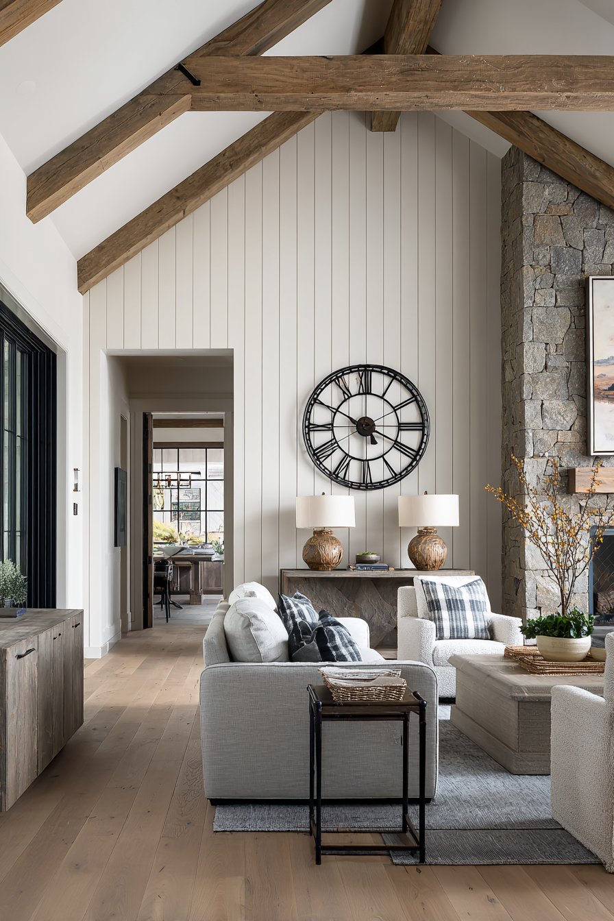 Modern farmhouse style embraces architectural texture through vertical shiplap. The warm white painted boards create dimensional interest. Shadow lines between planks add subtle depth. A large wrought iron clock provides the singular decorative focal point.