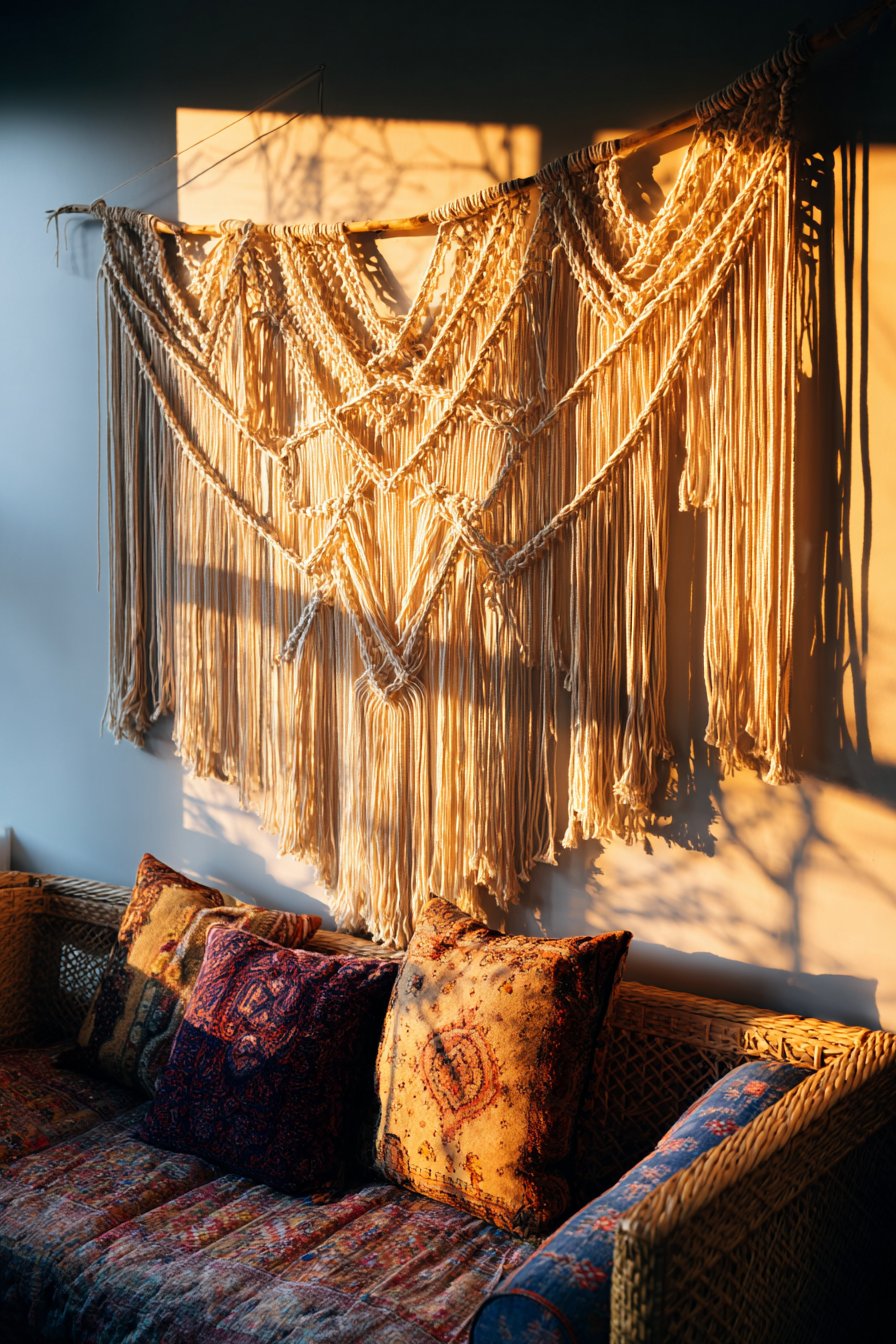 - Use jewel-tone accents to complement neutral macramé