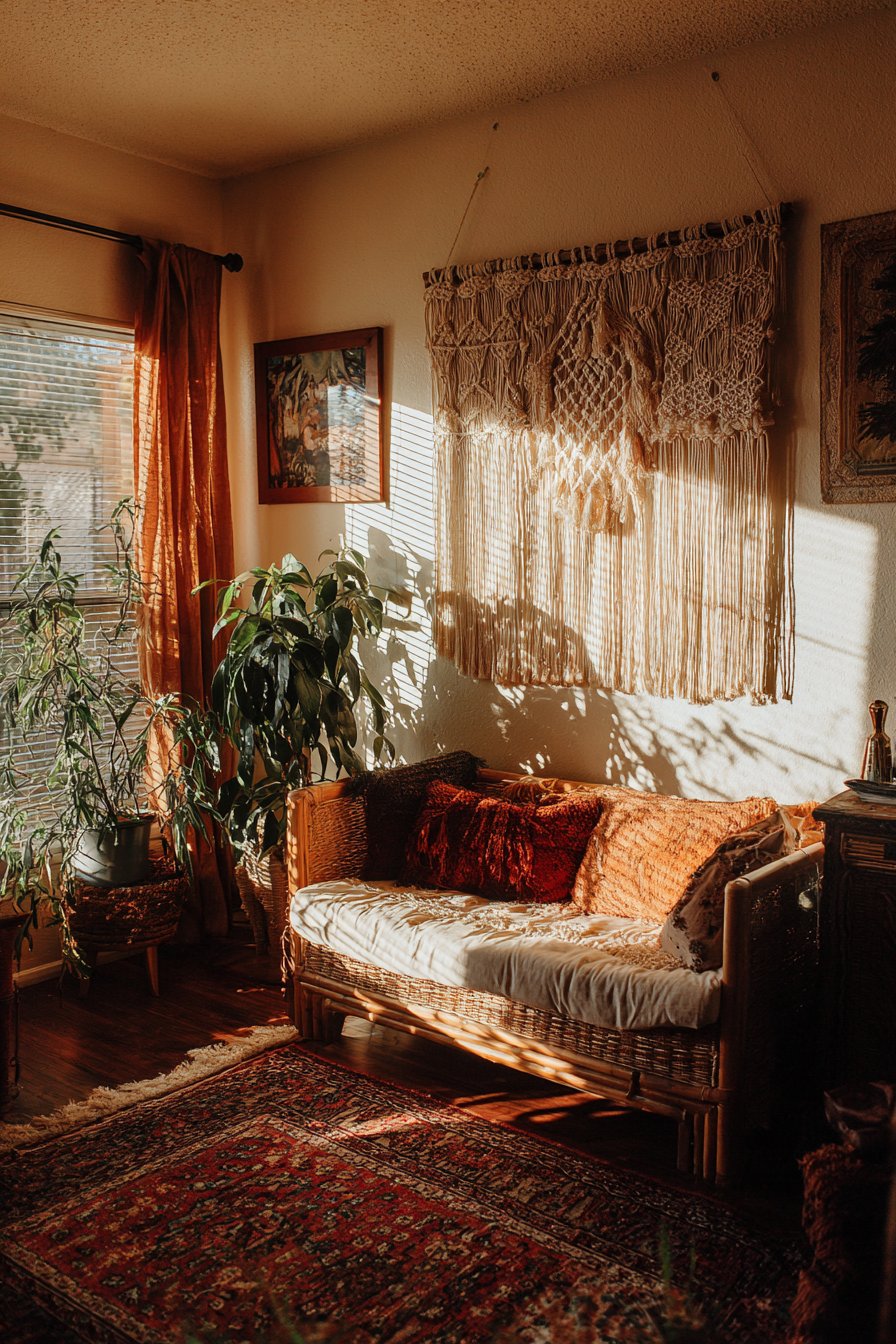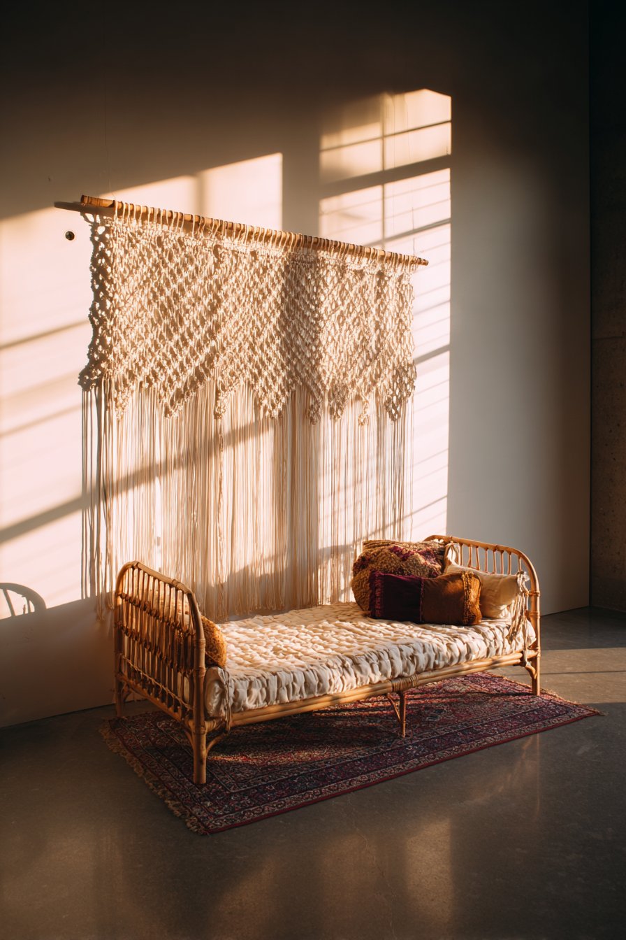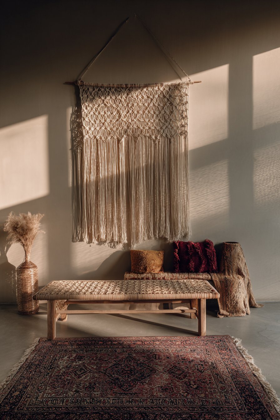 A low-slung rattan bench sits below the macramé artwork. Woven texture repeats throughout the natural fiber theme. Layered textiles include a vintage Persian rug. Velvet throw pillows in jewel tones provide color pops.