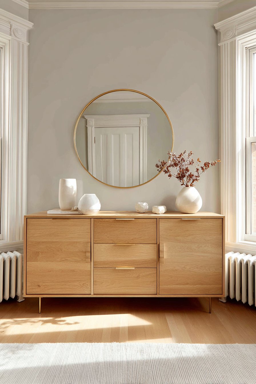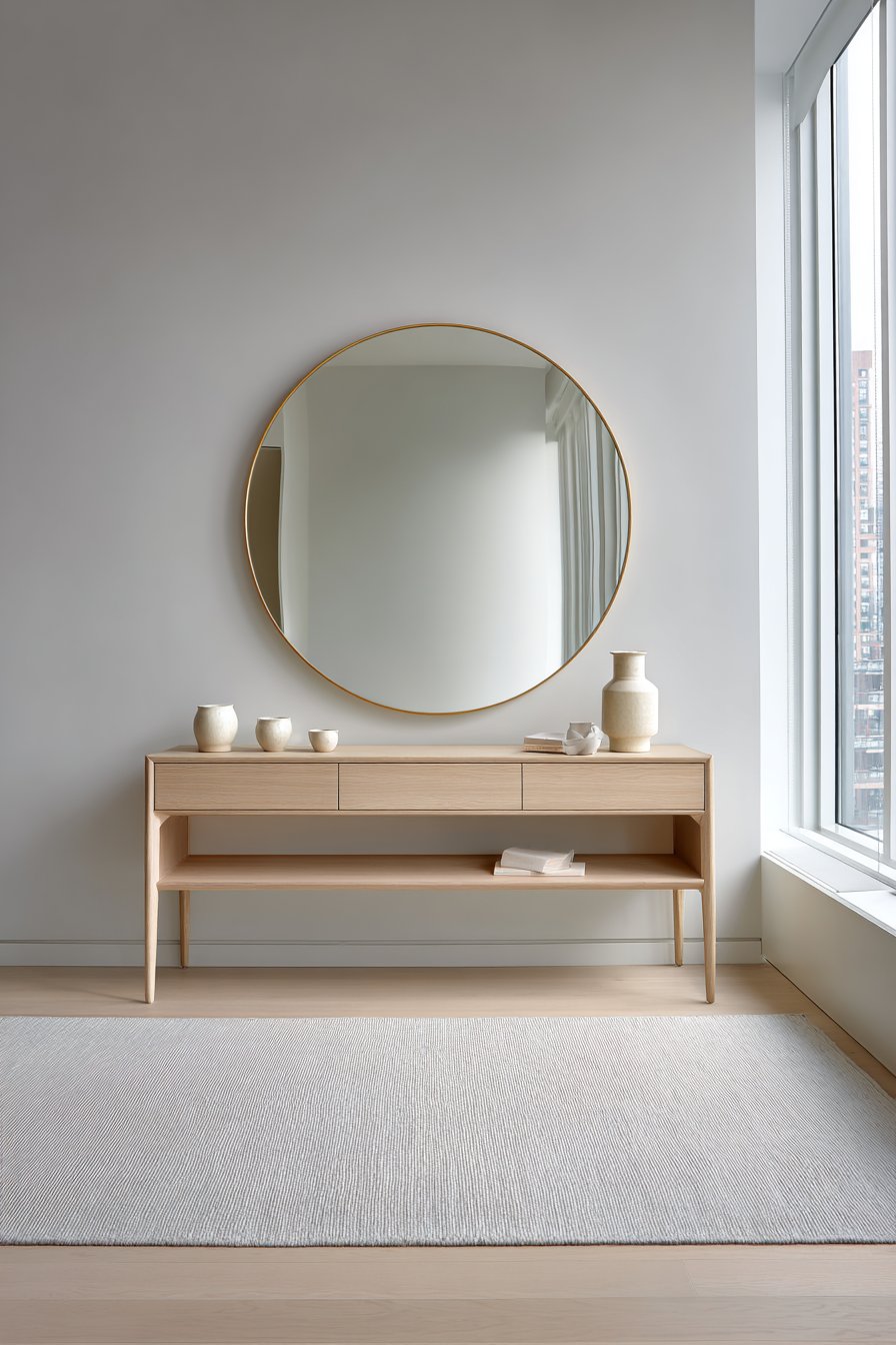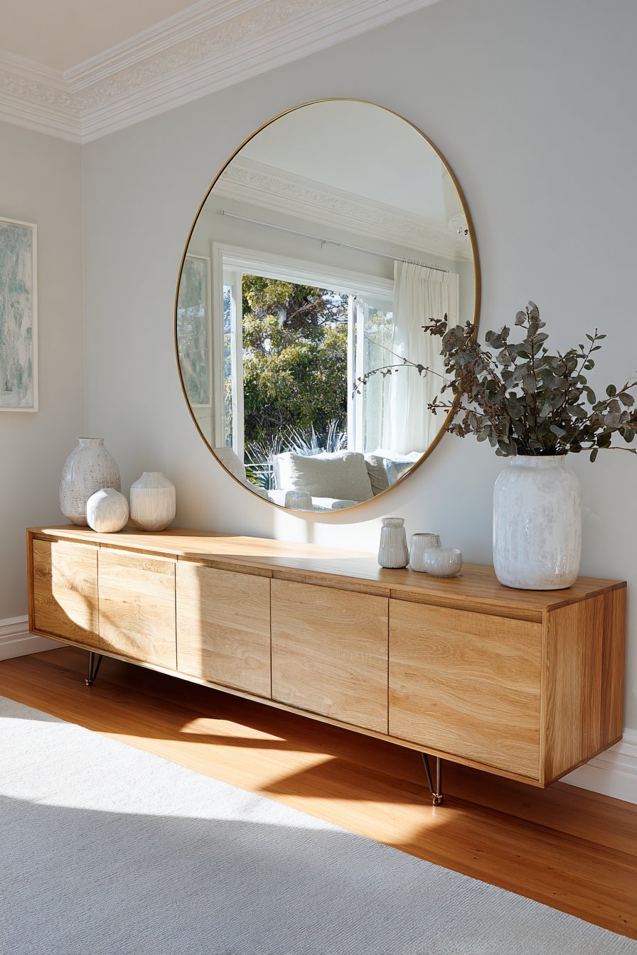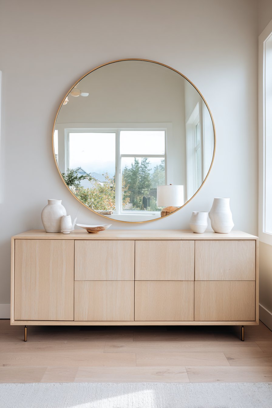 Scandinavian simplicity centers on a forty-eight inch round mirror. The thin brass frame adds subtle metallic warmth. Reflected natural light visually expands the entire space. This functional artwork brightens while creating depth perception.