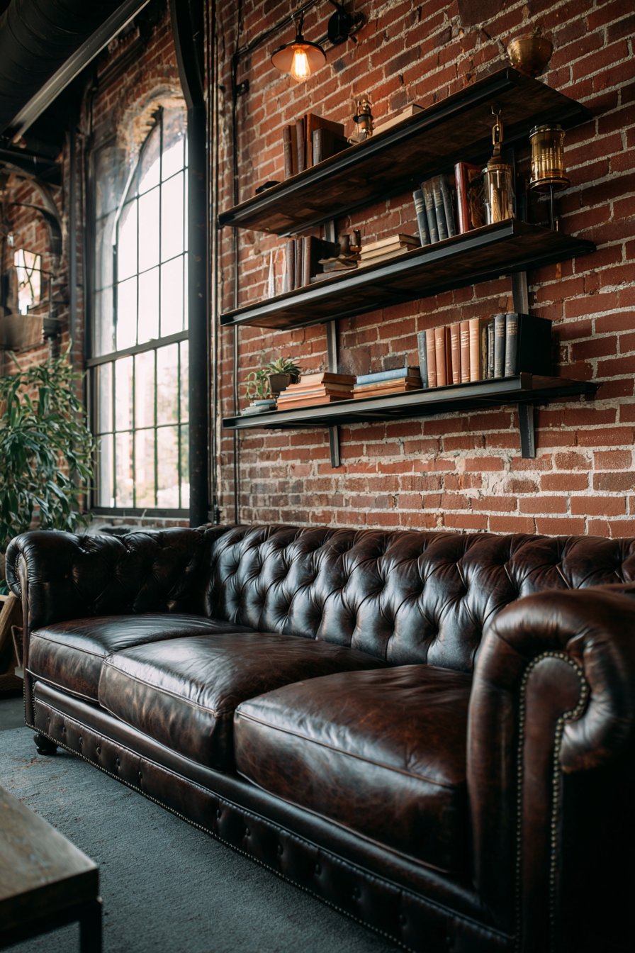 A chocolate brown leather Chesterfield sofa anchors the seating area. The tufted leather adds refined contrast to raw brick. Natural light from factory windows illuminates texture variations. Individual brick colors and mortar lines create organic patterns.